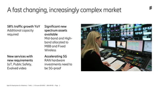 The document discusses Ericsson's solutions for simplifying and accelerating the rollout of 5G networks. It introduces Ericsson Spectrum Sharing to enable 5G deployment using existing spectrum bands. It also highlights the new Street Macro solution combining baseband, fronthaul, and mmWave radio to increase network capacity density in urban areas. Additionally, it presents the new RAN Compute portfolio and enclosures to provide deployment flexibility and reduce total cost of ownership for operators migrating to 5G.