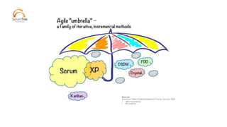 Документ описывает проблемы традиционного подхода к разработке программного обеспечения, включая низкий уровень успешности проектов и неэффективность в использовании функций. Он выделяет преимущества agile-методов, таких как вовлеченность пользователя, итеративность и гибкость в требованиях. Также обсуждаются роли в agile-командах и основные принципы методологии, включая Daily Scrum и Scrum Master.