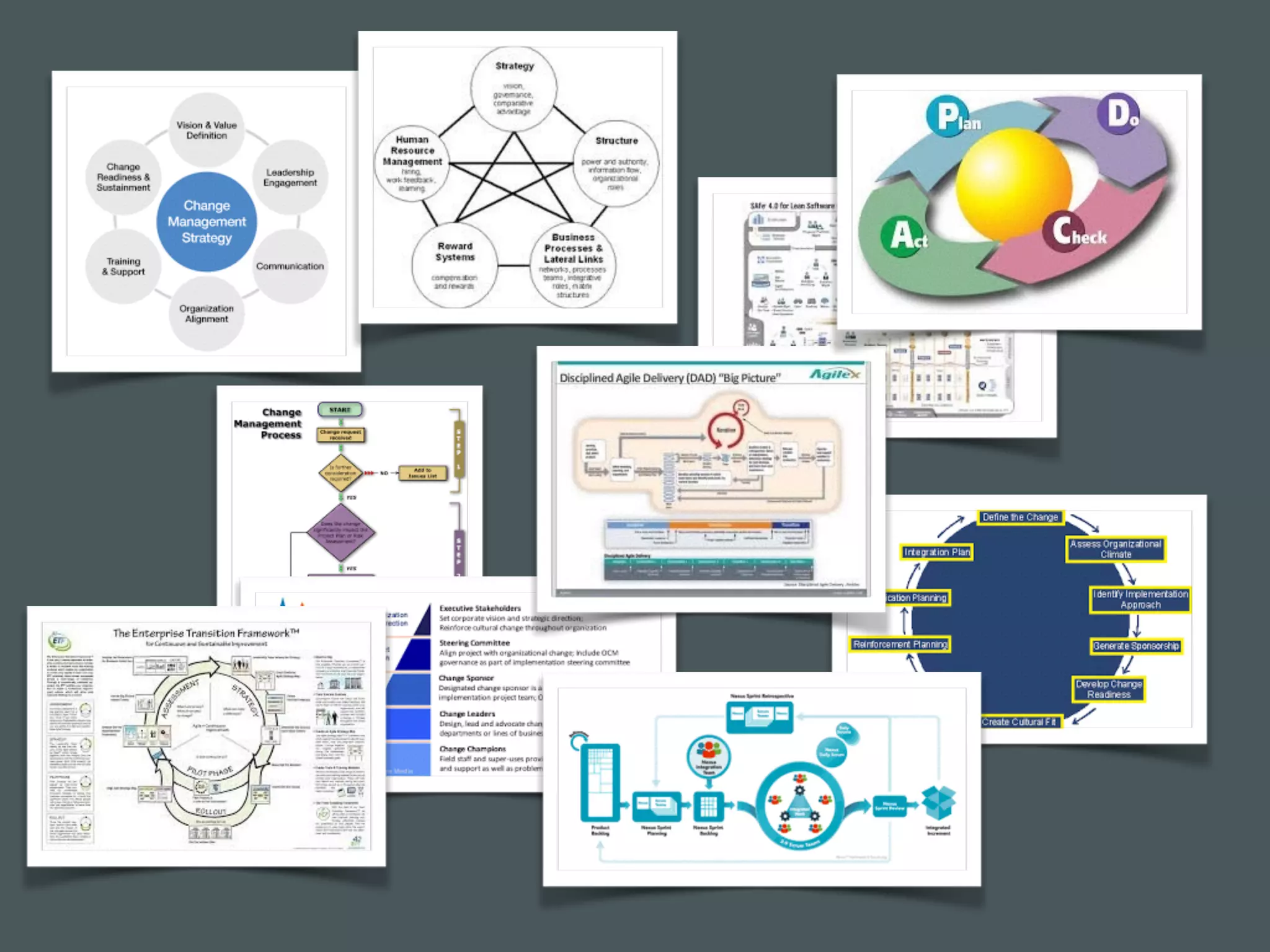 The document discusses rethinking agile transformations in organizations. It suggests that organizations often go about transformations incorrectly by "doing Agile" rather than "being Agile", which can lead to failures. It advocates modeling the change desired, telling stories, and provoking conversations to help transformations emerge and coalesce naturally from the bottom-up, rather than being imposed from the top-down through centralized control which can cause bureaucratization and the loss of early adopters. The key is focusing on the original purpose of the transformation rather than just adopting practices for their own sake.