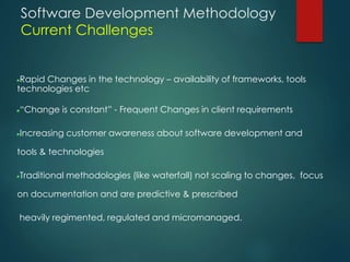 Traditional software development methodologies were not well-suited to frequent changes in requirements. Newer agile methodologies like Agile and XP emphasize adaptability, iterative development, and communication between developers and customers. These methodologies may provide better efficiency and quality outcomes than traditional predictive models. While documentation is still important, agile focuses on executable work products over speculative documentation and emphasizes that documentation should have clear benefits outweighing production costs. Choosing the right methodology requires considering an organization's goals and ability to manage challenges in a dynamic business environment.