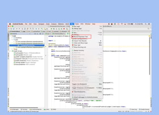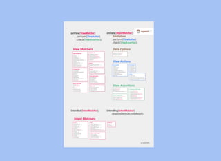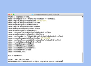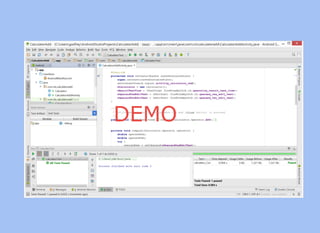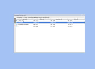 The document provides a comprehensive overview of unit and UI testing in Android development, focusing on key tools such as JUnit, Espresso, and Test Driven Development (TDD). It outlines practical examples and code snippets for setting up tests, assertions, and continuous integration practices to enhance code quality. Additionally, it emphasizes the importance of regression testing and maintaining a clean codebase through effective unit testing methodologies.
