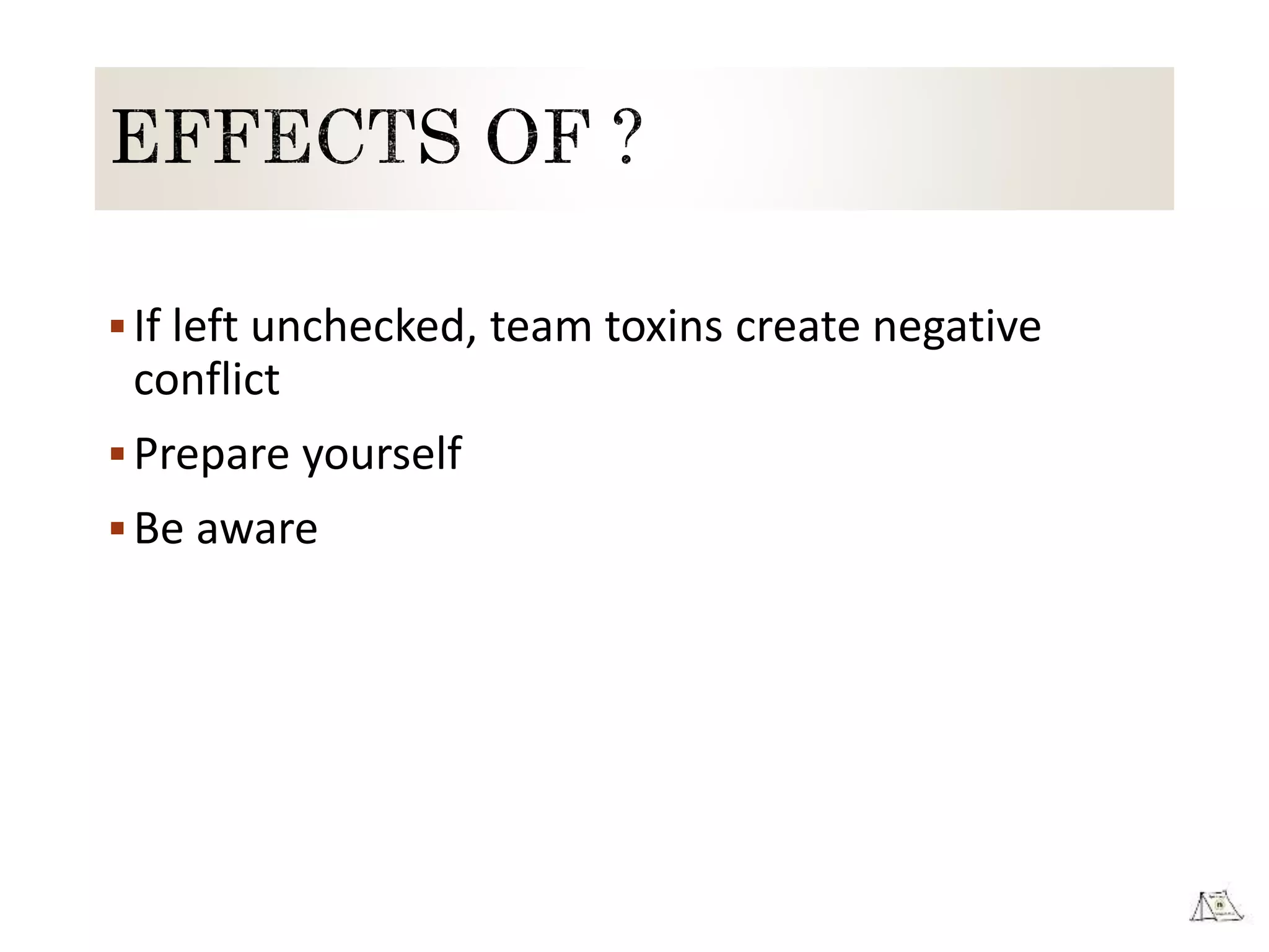 This document discusses team toxins and how to address them. It identifies common toxins like stonewalling, defensiveness, blaming, and contempt. Left unchecked, these toxins can create negative conflict. The document recommends being aware of toxins and preparing yourself by developing emotional intelligence. It also suggests having team working agreements and a conflict protocol in place to productively manage conflict and hold one another accountable. This will help prevent toxins from building and leading to increased conflict within the team.