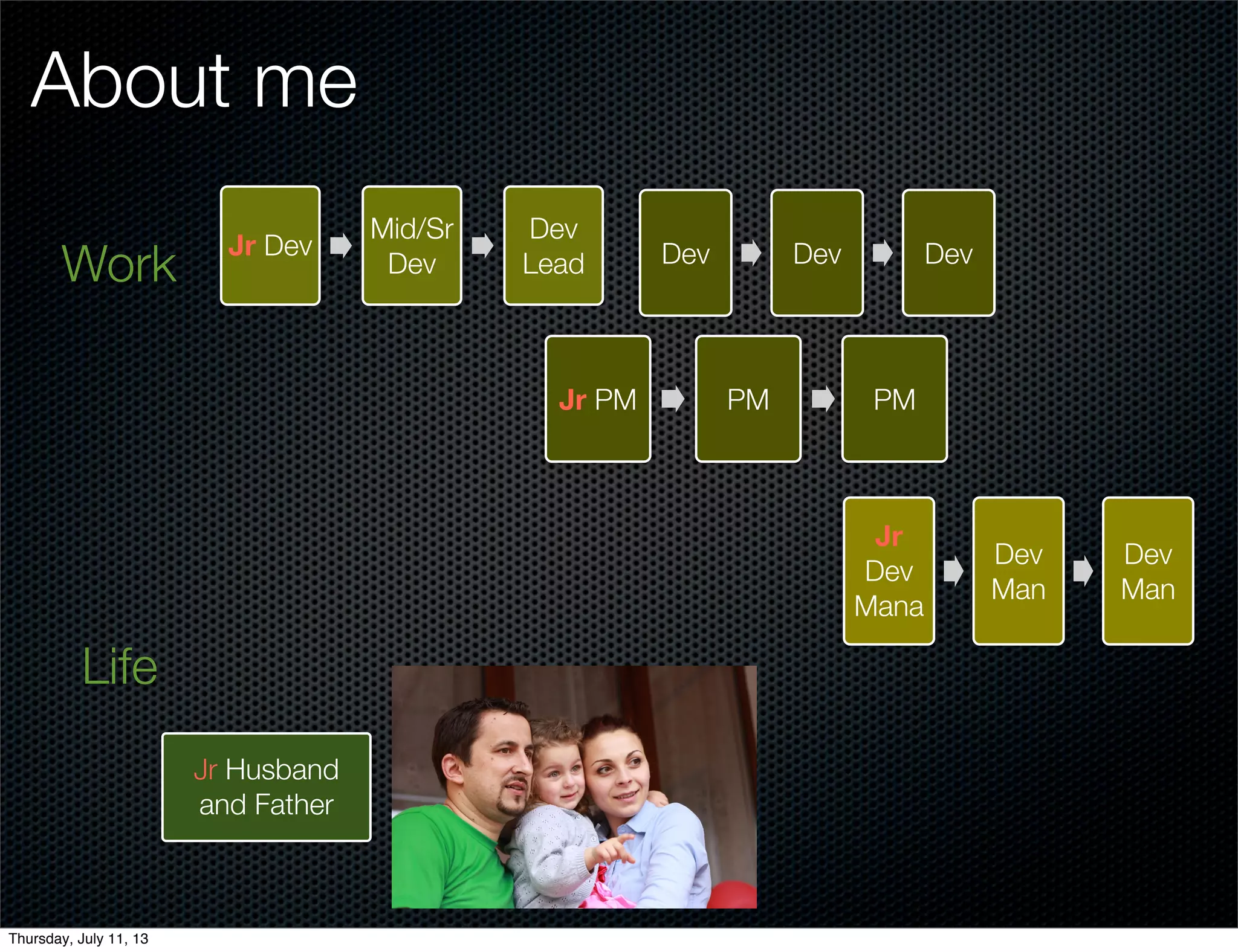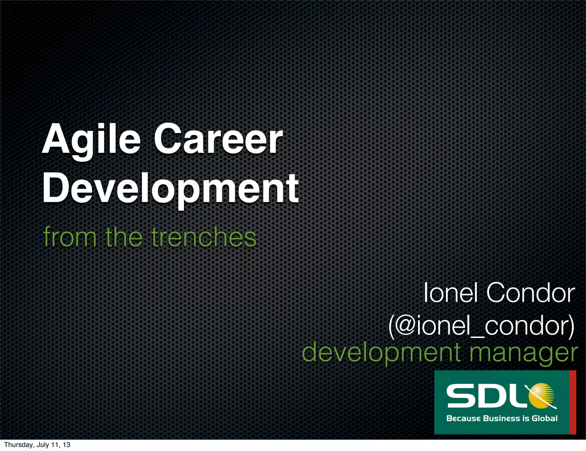 The document discusses an agile approach to career development. It provides examples of how to develop career objectives and plans through self-reflection, experiments, mentorship and continuous learning. Powerful questions are suggested to help individuals understand their strengths and opportunities. Common career traps are also outlined, such as lack of practice, inadequate resources or wrong expectations. The presentation emphasizes treating one's career as an ongoing experiment and keeping it in a state of continuous improvement.