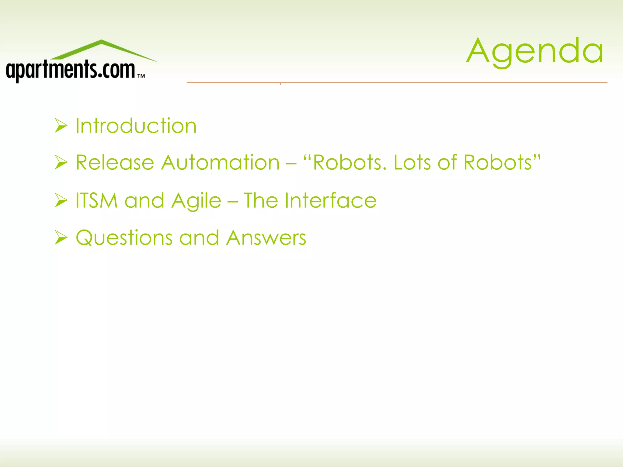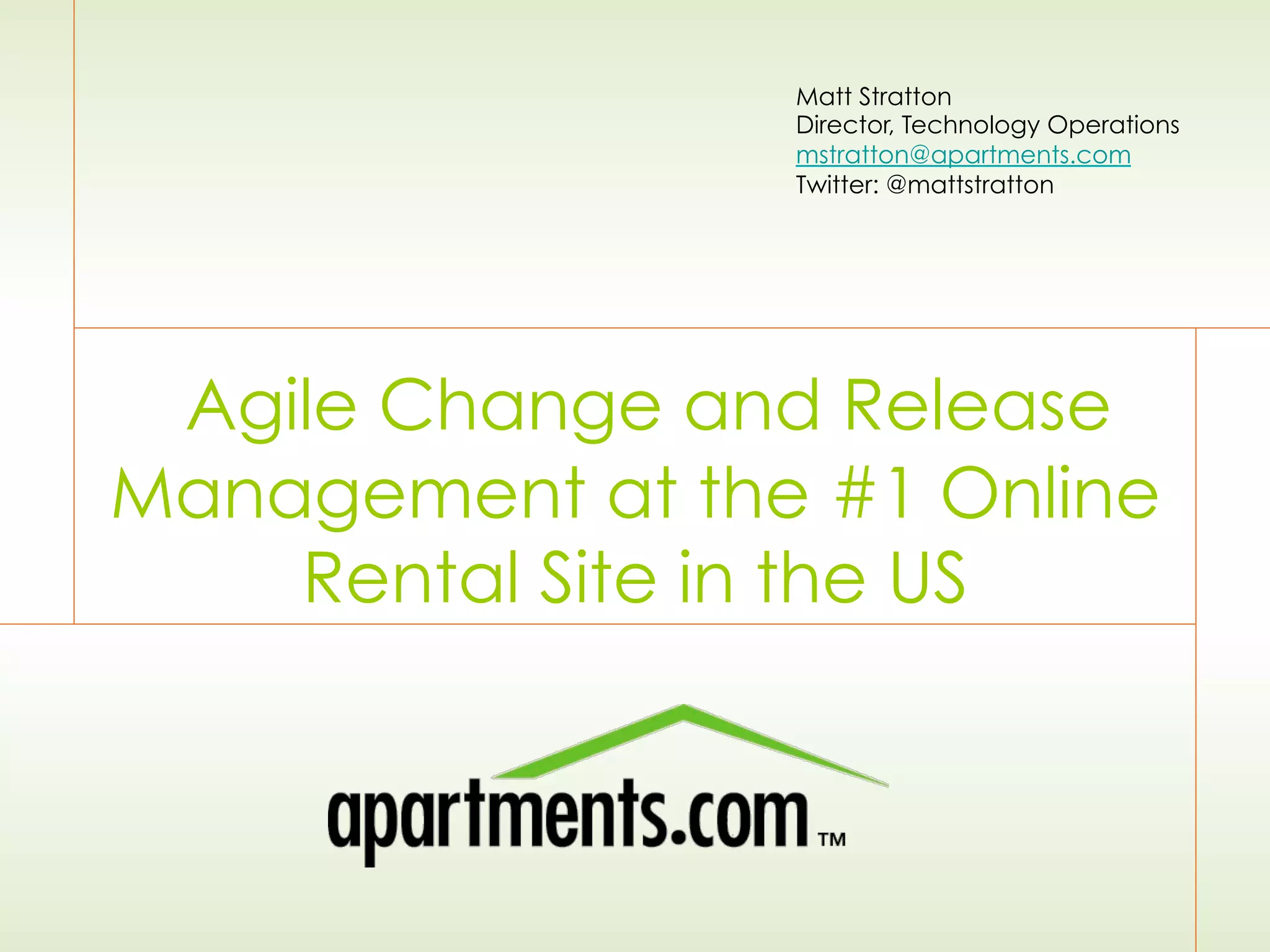 The document discusses the implementation of agile change and release management at Apartments.com, focusing on the transition from traditional release methods to a more automated process using tools like Serena Release Automation. It highlights the challenges faced, such as resource bottlenecks and environment issues, and outlines solutions that improved efficiency and democratized the release process. Future plans include automating the integration of ITIL processes with agile methodologies and enhancing continuous delivery frameworks.