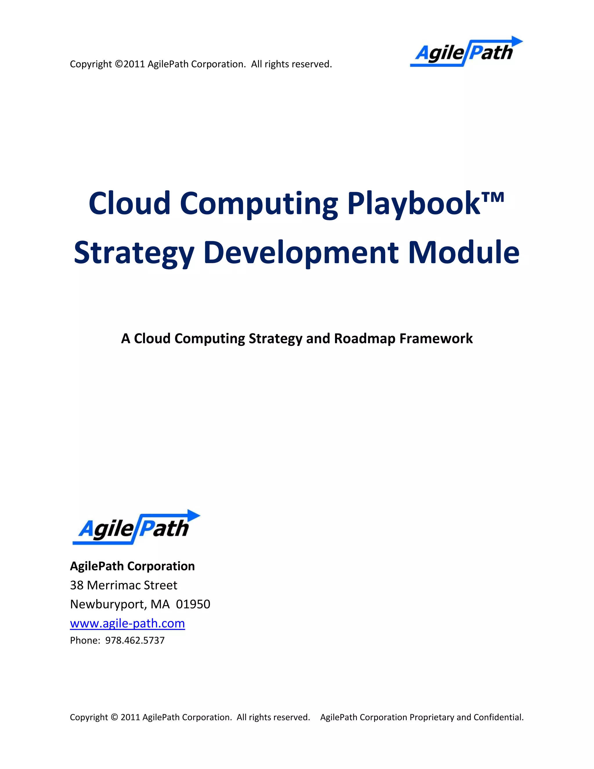 This document outlines the AgilePath Cloud Computing Playbook, a comprehensive framework for developing a cloud computing strategy and roadmap. It provides a structured approach with a focus on cloud business discovery, strategy development, mobilization, and implementation, emphasizing actionable methodologies for organizations. The playbook serves as a guide for creating cloud initiatives aligned with business objectives, leveraging various supporting artifacts for effective decision-making and implementation.