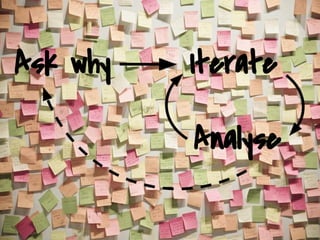 The document outlines an iterative agile content strategy approach that involves analysing information, iterating on improvements, and repeating the process. It emphasizes asking "why?" instead of "what?" and iterating without waiting. The key steps are to analyse, iterate repeatedly, and analyse again to continuously improve content.
