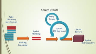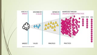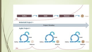 The document provides an overview of agile project management. It begins by outlining some of the flaws and weaknesses of traditional waterfall models. It then discusses what agile is, defining it as an iterative approach focused on rapid delivery and ability to respond to change. The agile manifesto and principles are explained. Key agile concepts like user stories, acceptance criteria, epics are introduced and examples are provided. Finally, it covers some advantages and disadvantages of the agile methodology.