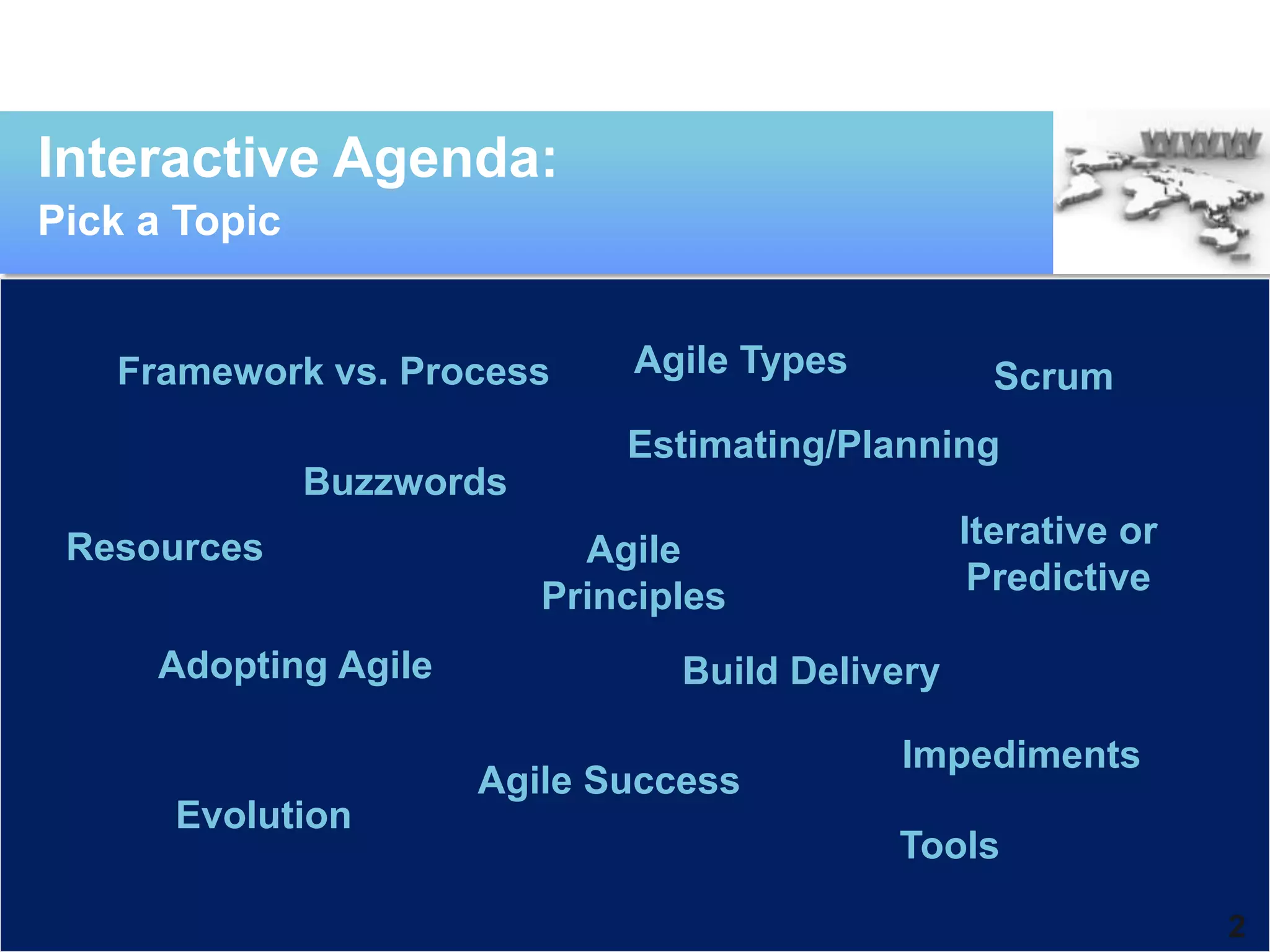 This document provides an overview of agile development and product delivery methods for successful organizations. It includes an interactive agenda covering topics such as agile frameworks versus processes, common agile methodologies like Scrum, planning and estimating, principles of agile development, adopting agile practices, and potential impediments to agile adoption.