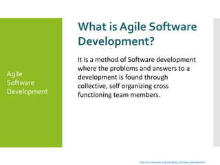 The document discusses Agile software development. It provides information on what Agile development is, the main phases (requirements planning, design workshop, implementation), and that the process can repeat until customer satisfaction. It notes Agile development allows for rapid development, involvement of customers, and uses tools and teamwork. Benefits include improved quality, opportunities for corrections, customer satisfaction, and faster time to market. However, disadvantages include needing active user involvement throughout and new requirements potentially arising during development.