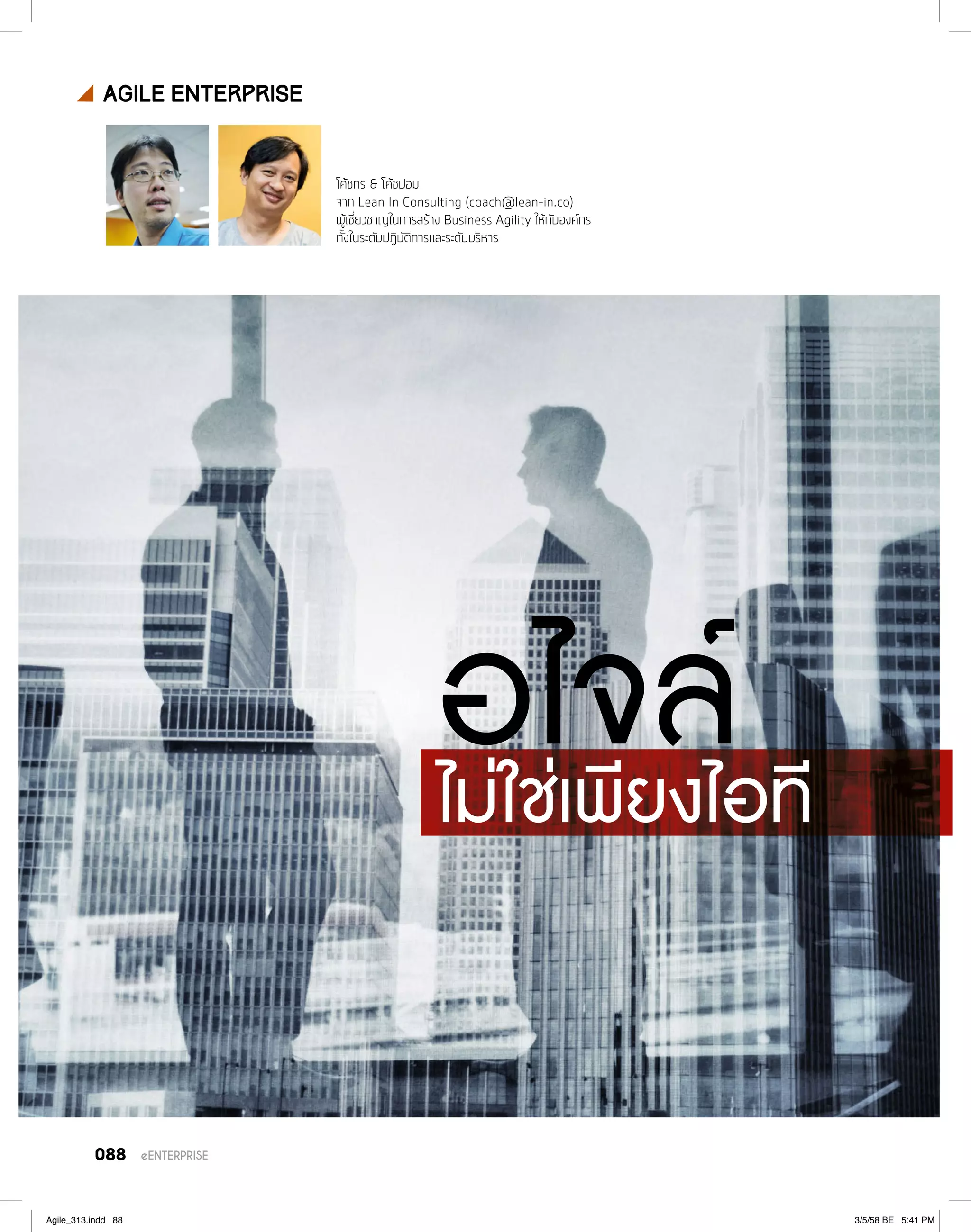 อไจล์ไม่ใช่เพียงไอทีแต่เป็นเรื่องความอยู่รอดทางธุรกิจ - บทความจากคอลัมน์ Agile Enterprise เขียนโดยโค้ชกรและโค้ชปอมจาก Lean In Consulting ในนิตยสาร eLeader ฉบับเดือน มีนาคม 2558