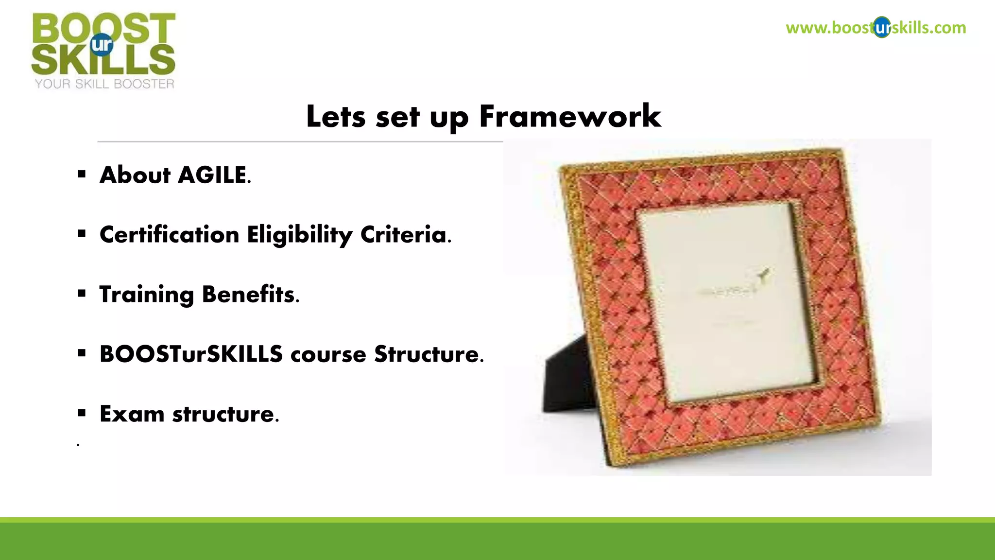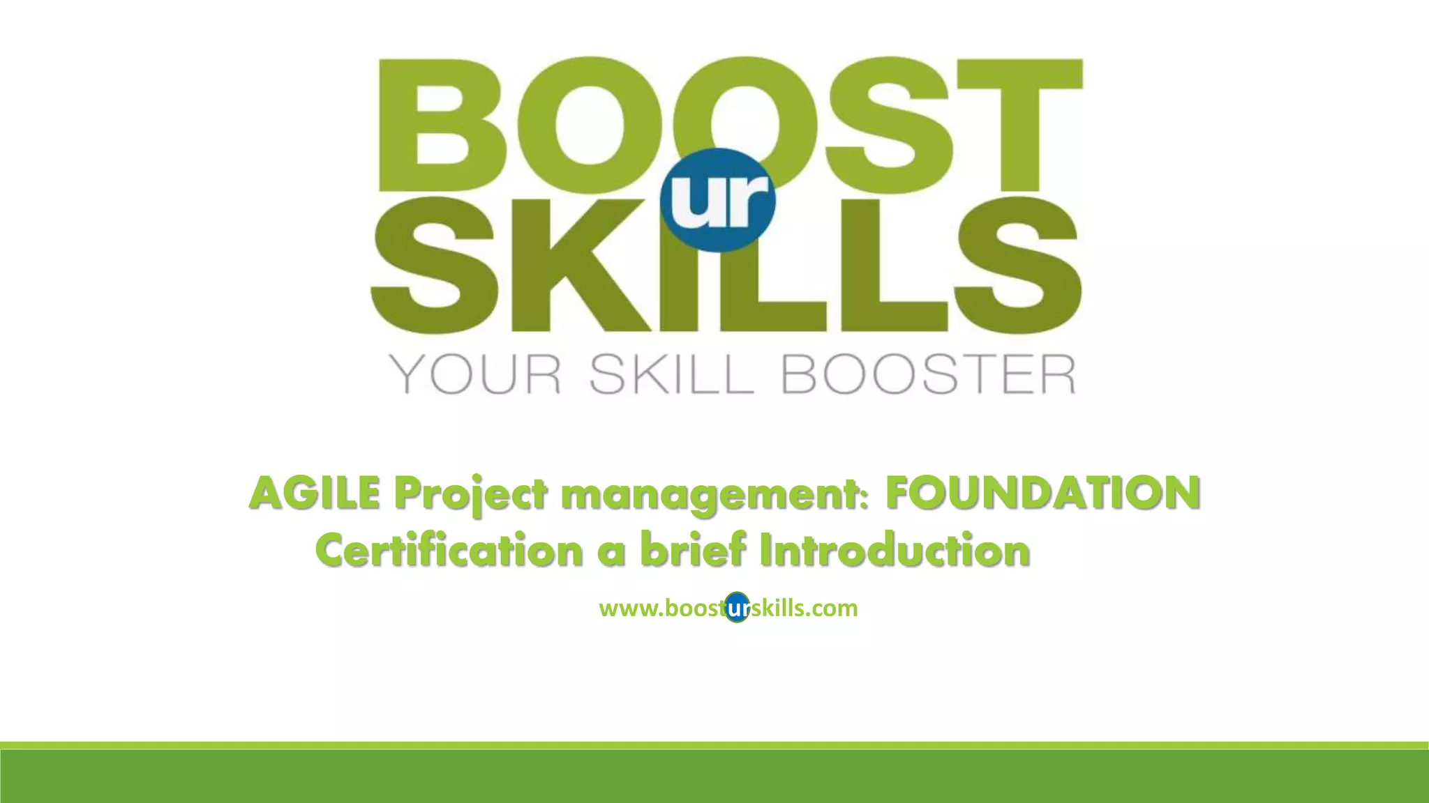 This document provides information about Agile project management certification offered by BOOSTurSKILLS. It discusses what Agile methodology is, eligibility criteria which requires a bachelor's degree and training from an affiliated organization. It outlines the course structure which covers Agile fundamentals, life cycle, roles and responsibilities over 3 days. It also mentions the exam will be for 1.5 hours with 100 multiple choice questions and a passing score of 55 is required to obtain the Agile certification.