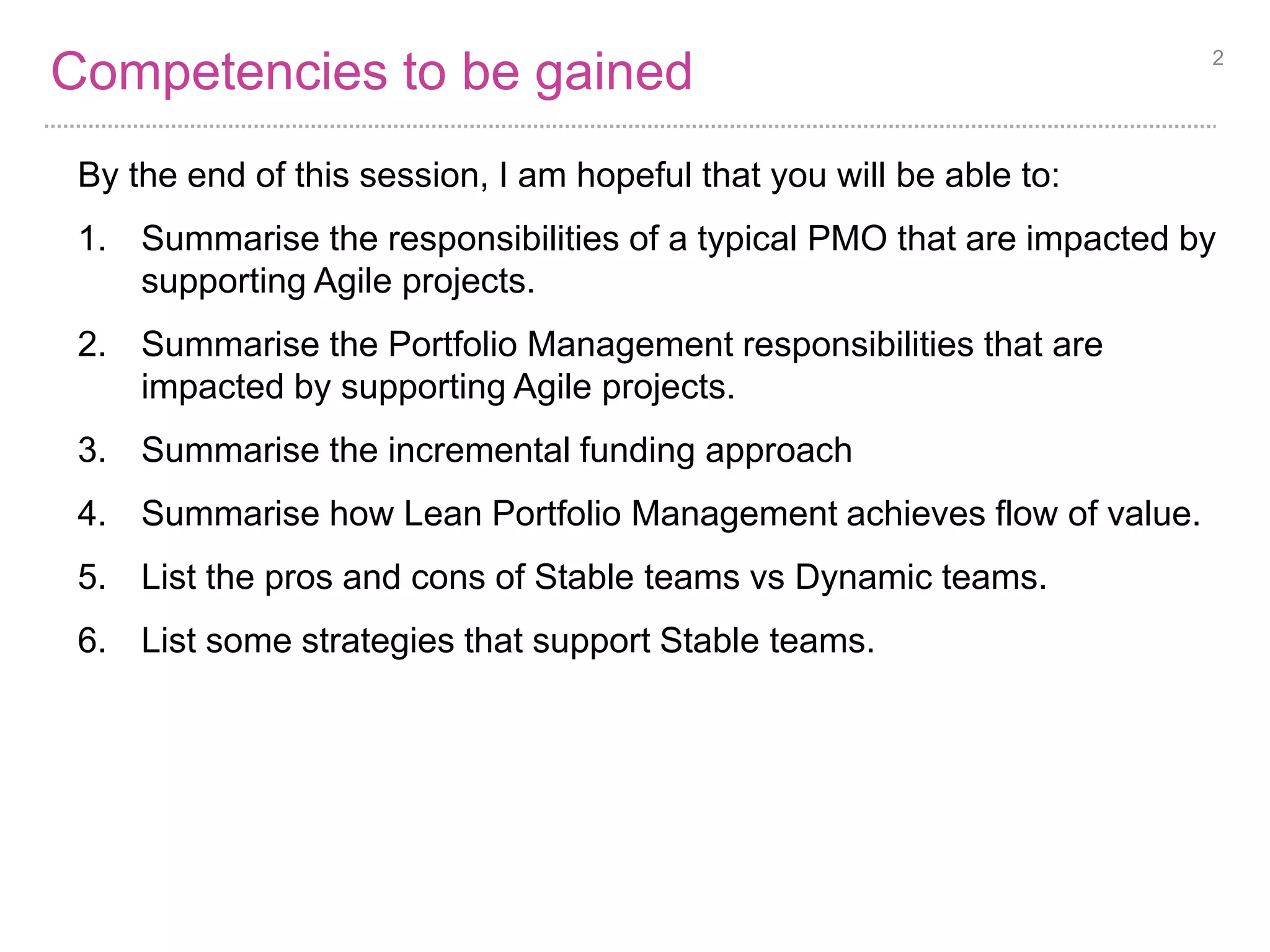 The document discusses responsibilities and competencies for an Agile/Lean Project Management Office (PMO). It describes how a PMO can support Agile projects through stable teams, empowering teams, limiting work in progress, and regularly reassessing value delivery. It also discusses portfolio management responsibilities like achieving continuous flow of business value through short cycle times and validated learning over business cases. The document recommends incremental funding approaches and consistency across processes to support Agile/Lean practices.