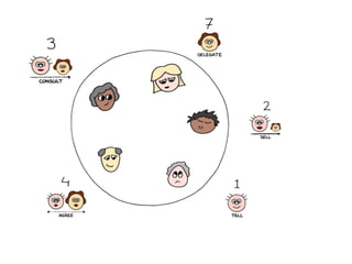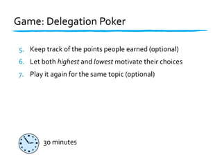 The document discusses the concept of empowering self-organizing teams within a management framework, highlighting the importance of distributed authority and trust. It outlines various leadership styles, delegation techniques, and the significance of situational leadership to foster teamwork and decision-making. Key decision areas and a delegation poker game are introduced as tools for clarifying roles and enhancing collaboration among team members.
