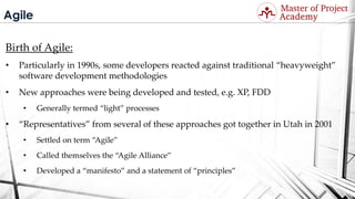 The document outlines the origins of Agile methodology, which emerged as a response to traditional software development methods in the 1990s, culminating in the Agile Manifesto in 2001. Agile emphasizes adaptability, collaboration, and customer satisfaction, prioritizing individuals and interactions, working software, and responsiveness to change over conventional practices. It also details various Agile frameworks and methodologies, including Scrum, Extreme Programming (XP), Lean, and Kanban, each with its principles and practices aimed at fostering effective development processes.