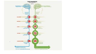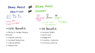 This document discusses the agile mindset and contrasts it with the traditional waterfall mindset. It defines mindset as a person's way of thinking and opinions. The agile mindset values individuals and interactions, customer collaboration, responding to change, and valuing working software over documentation. It also discusses agile principles, practices like Scrum and Kanban, and the differences between doing agile and having an agile mindset. The document contrasts fixed and growth mindsets and provides indicators of an agile mindset at both the team and organizational levels. It also discusses common agile pitfalls and provides resources for further reading.