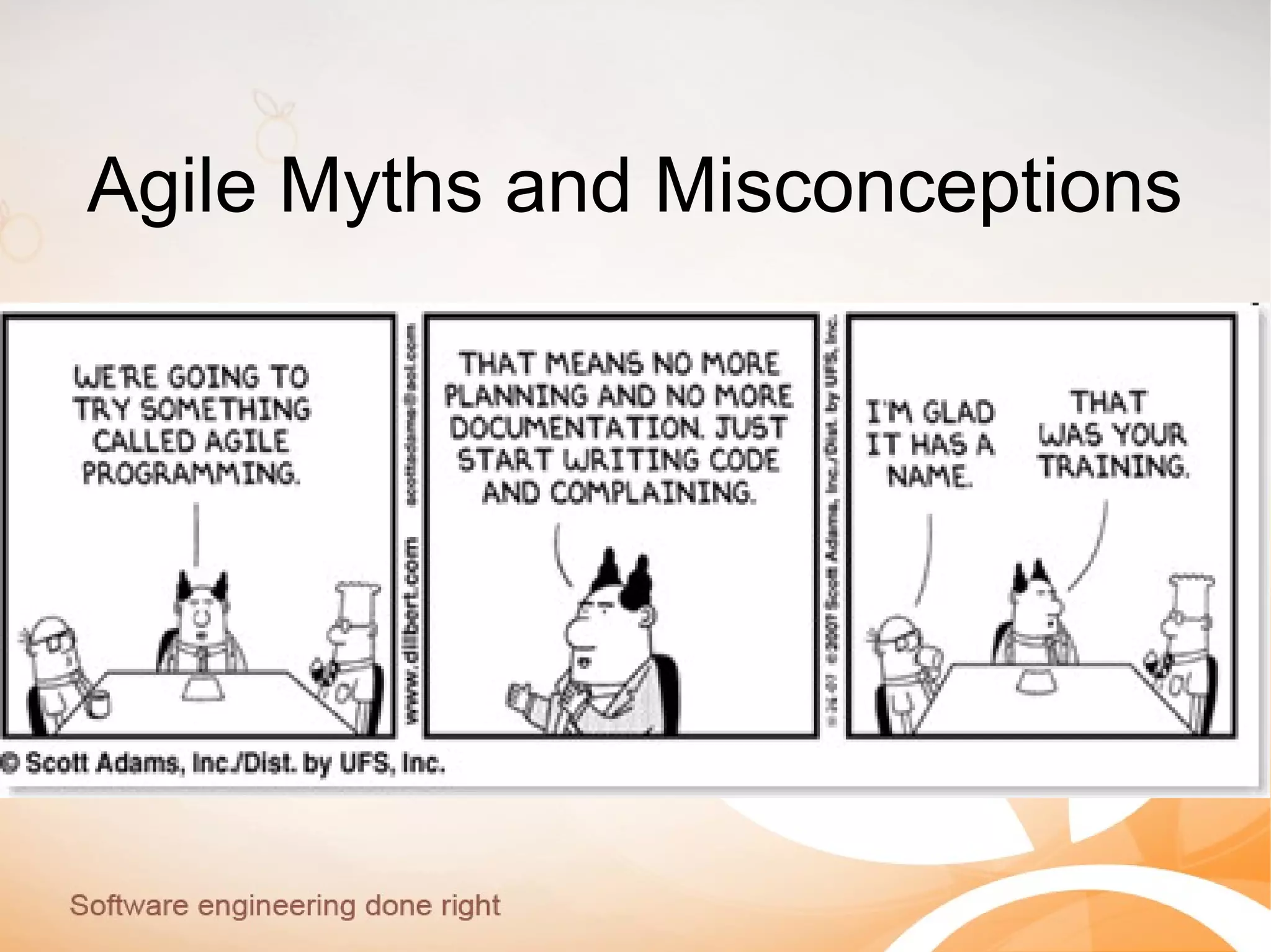 The document discusses 12 common myths and misconceptions about agile practices. It summarizes that agile is based on principles and values rather than rigid methodologies. Additionally, it emphasizes that agile focuses equally on engineering practices as project management. Iterative development aims to evolve working software incrementally rather than view a project in isolated milestones. Budgets are fixed while scope is variable to allow for adapting to feedback. Problems are expected to surface earlier when using agile to allow for easier fixing compared to later discovery in waterfall approaches. Documentation and design are evidence-based rather than speculative upfront plans. Adopting agile is an ongoing cultural shift rather than a single change and continuous improvement is key.