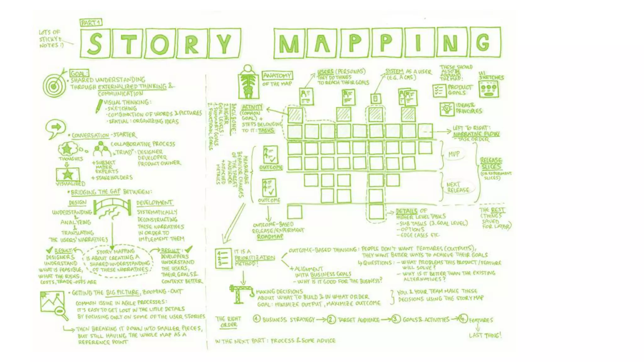 The document discusses key Agile concepts like user stories, epics, features, and release planning. It explains how to create a story map to visualize the customer journey rather than a flat backlog. A story map focuses on customer outcomes, brings the customer journey to life, and allows prioritizing work based on value to the customer. It also discusses the lifecycle of a user story, differences between features, epics, and stories, and converting a product backlog to a sprint backlog.