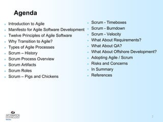 The document provides an overview of Agile development and Scrum methodology. It discusses key Agile concepts like the Agile Manifesto, Scrum roles and artifacts, timeboxing, and metrics like velocity and burndowns. It also addresses adopting Agile, working with requirements and QA, and challenges of offshore development in an Agile model.