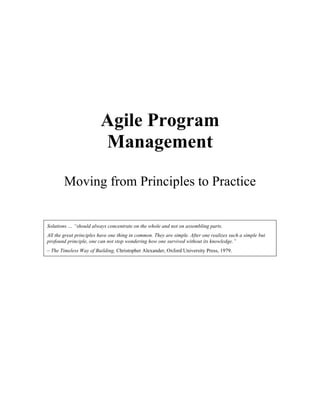 The document discusses agile program management, highlighting its principles and practices that connect strategy with execution to address traditional project management shortcomings. It outlines five key principles of agile program management that enhance project deliverability by focusing on whole outcomes rather than linear processes. By incorporating elements such as balanced scorecards and capabilities-based planning, the agile approach aims to minimize execution gaps and adapt to changing business environments.