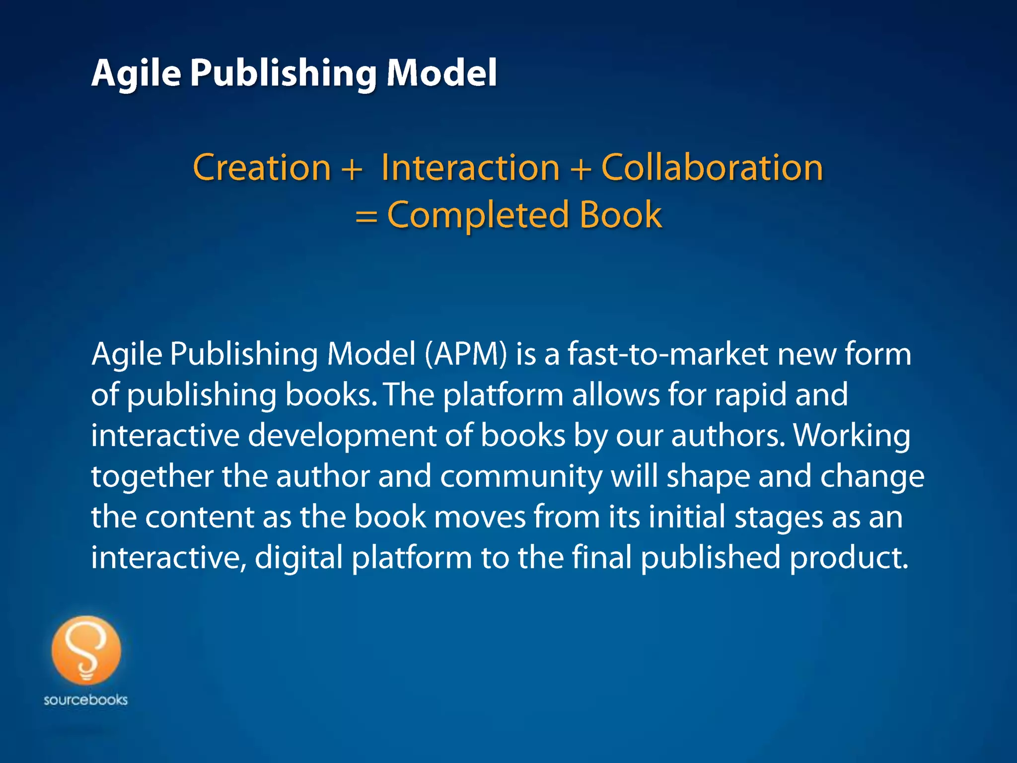 The document discusses an agile publishing model developed by Sourcebooks, Inc. that aims to be more reader-centric, efficient, supportive of authors, and timely. It involves developing content based on reader needs through a community network of users and creators. The model emphasizes starting with the customer experience, gathering feedback, iteratively developing modularized content, and experimenting to build what readers want. It also aims to better support authors financially and with marketing/sales. An example project to develop and publish the book "Entering the Shift Age" using this agile model is described.