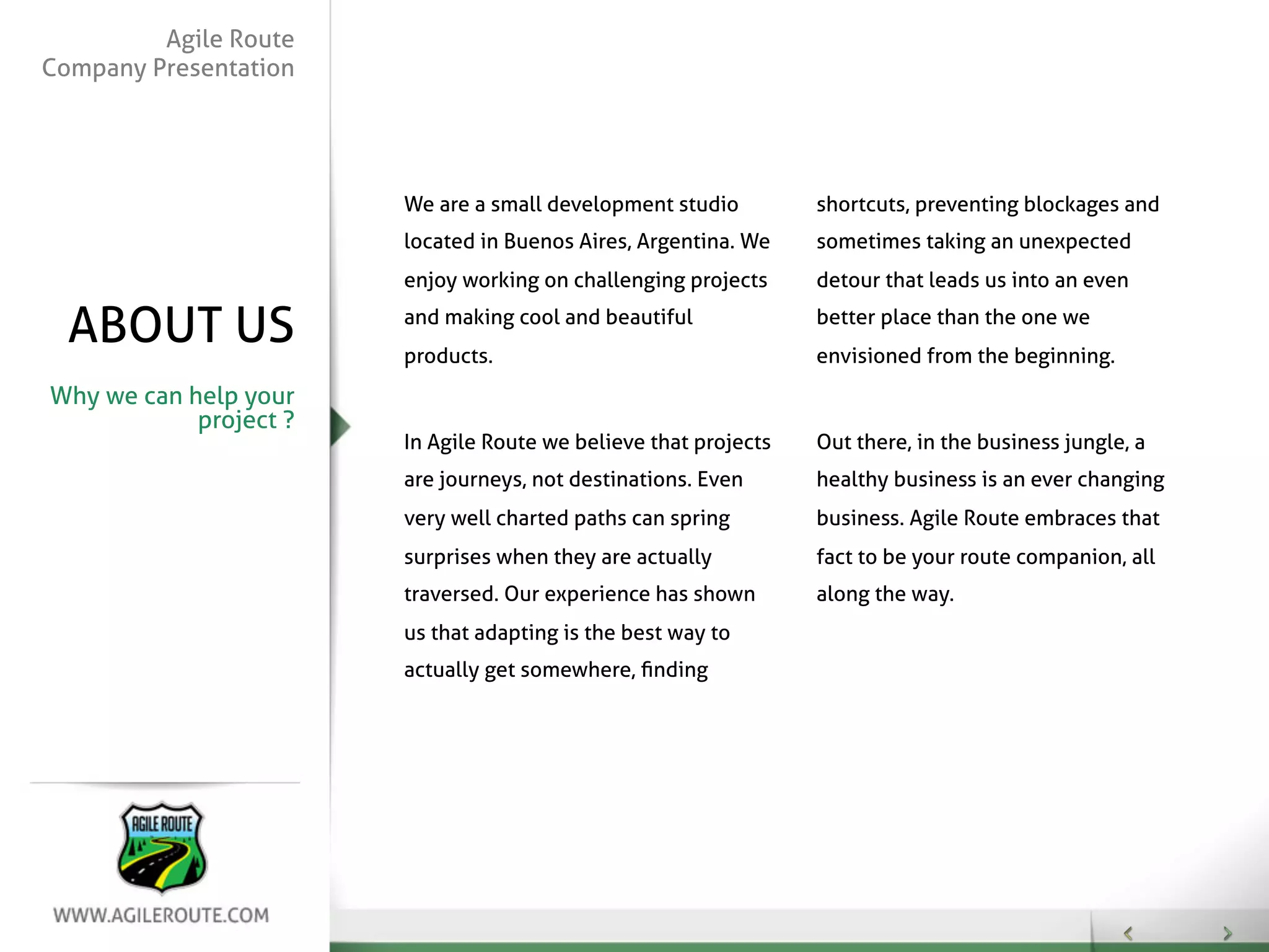 Agile Route is a small development studio based in Buenos Aires that focuses on agile methodologies, particularly Scrum, to adapt to the ever-changing business environment. They specialize in various services including agile product development, marketing management, and software integration, with a commitment to creating innovative applications. The studio has a diverse portfolio of successful apps and games, emphasizing their belief in technical excellence and adaptability to customer needs.