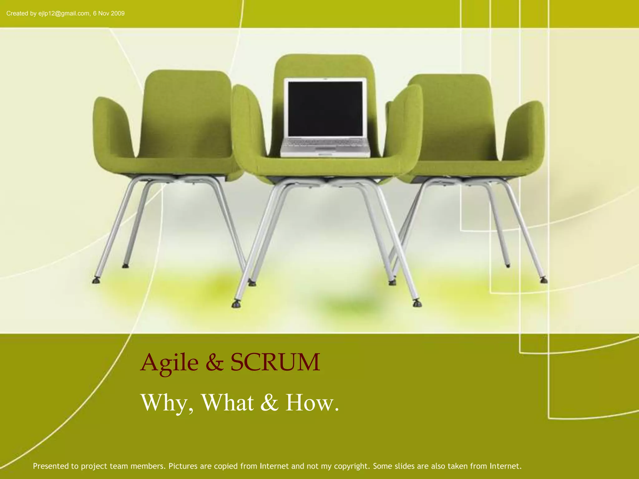 This document provides an overview of Agile methodology and SCRUM. It discusses the principles of Agile, including its emphasis on collaboration, adaptability, and delivering working software frequently. It then describes SCRUM in more detail, covering the roles of Product Owner, Scrum Master, and Team. The key SCRUM artifacts like Product Backlog, Sprint Backlog, and Burn Down Chart are explained. It also outlines the core SCRUM ceremonies of Sprint Planning, Daily Scrum, Sprint Review, and Retrospective. The document concludes by discussing challenges of adopting SCRUM and provides tips for SCRUM Team members.