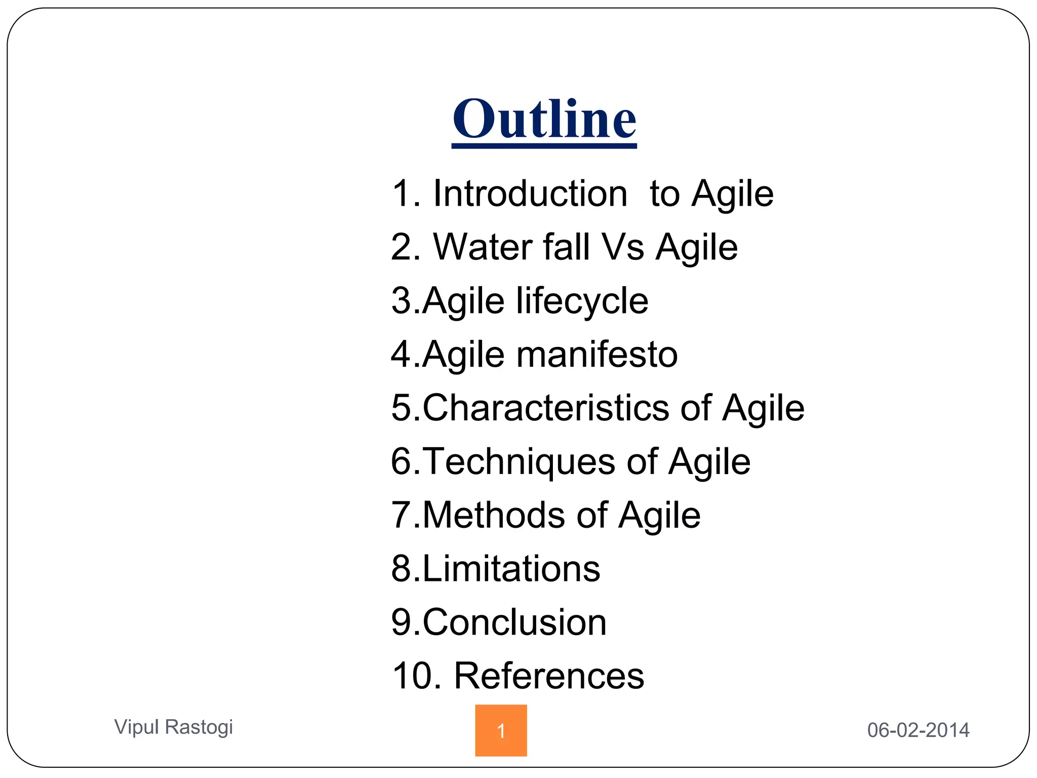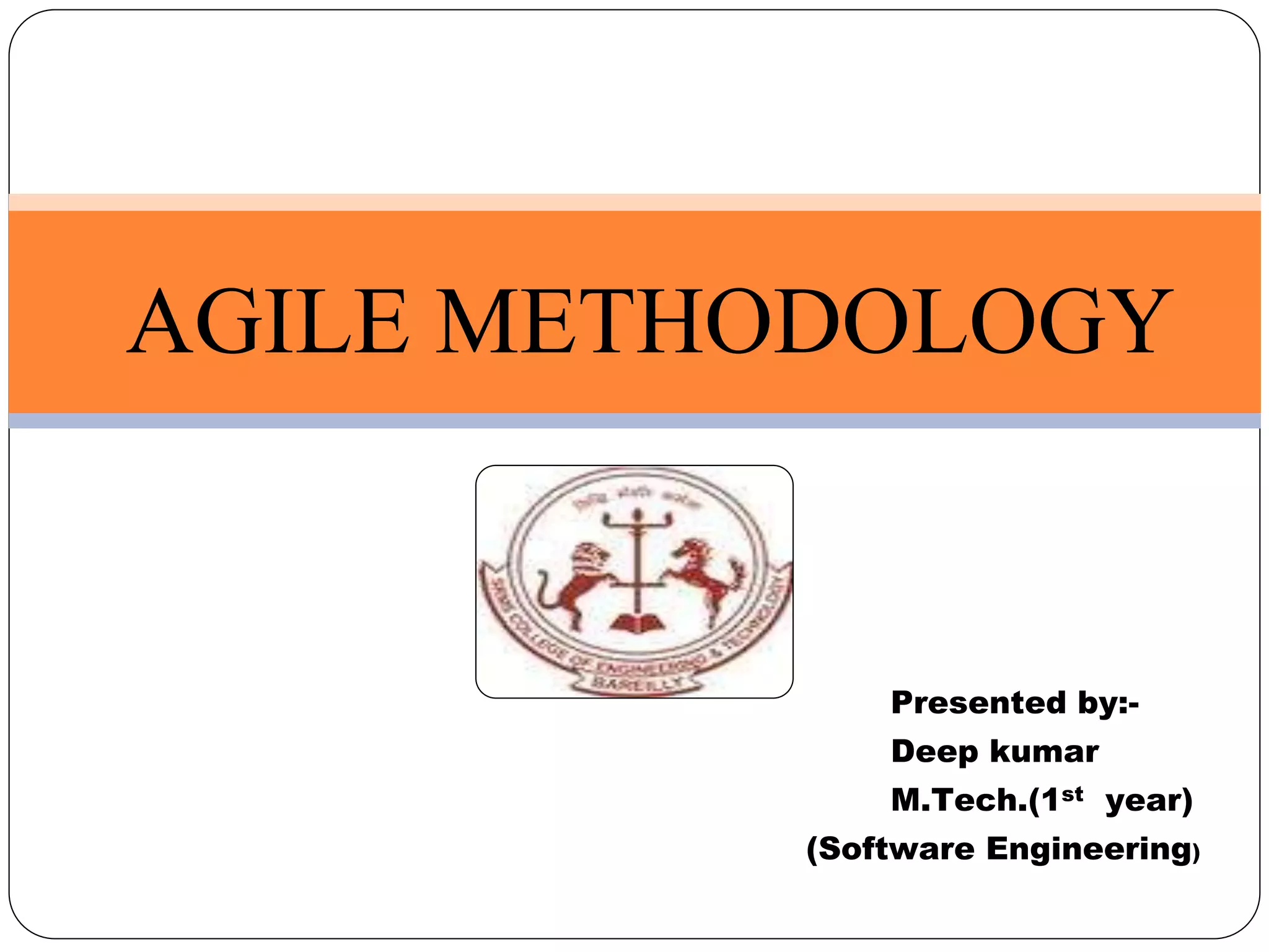 The document presents an overview of the Agile methodology. It defines Agile as an iterative and incremental approach that is highly collaborative. The key aspects of Agile that are covered include the Agile manifesto, principles and values, characteristics, techniques and methods such as scrum and extreme programming. Limitations of Agile and the benefits of its flexibility and ability to adapt to changing requirements are also discussed. In conclusion, Agile provides a more adaptive approach to software development.