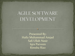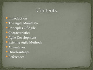 This document discusses agile software development methods. It outlines the agile manifesto which values individuals and interactions over processes, working software over documentation, and customer collaboration over contract negotiation. Some key agile principles include customer satisfaction, welcome changing requirements, and frequent delivery of working software. Common agile methods like extreme programming and scrum are also summarized. Advantages include improved customer satisfaction and responsiveness to change, while disadvantages include potential lack of documentation.