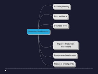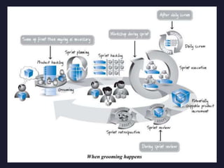 The document discusses agile software development, focusing on scrum methodology, user stories, and product backlog items (PBIs). It emphasizes the importance of ongoing conversation and negotiation in detailing requirements, the concepts of progressive refinement, and maintaining a dynamic and prioritized backlog. Additionally, it outlines the definitions of 'ready' and 'done' for PBIs to ensure that the scrum team can confidently commit to completing tasks within sprints.
