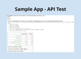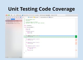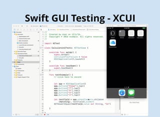 The document discusses Agile testing techniques for Swift including unit testing with XCTest and GUI testing with XCUI. It provides details on mocking with Cuckoo, API testing with Postman, integrating tests with Jenkins, and measuring quality with SonarQube. Sample code is shown for unit tests, API tests, and GUI tests of a sample ETAMock app. Continuous integration with Jenkins and SonarQube is demonstrated along with links for further information.