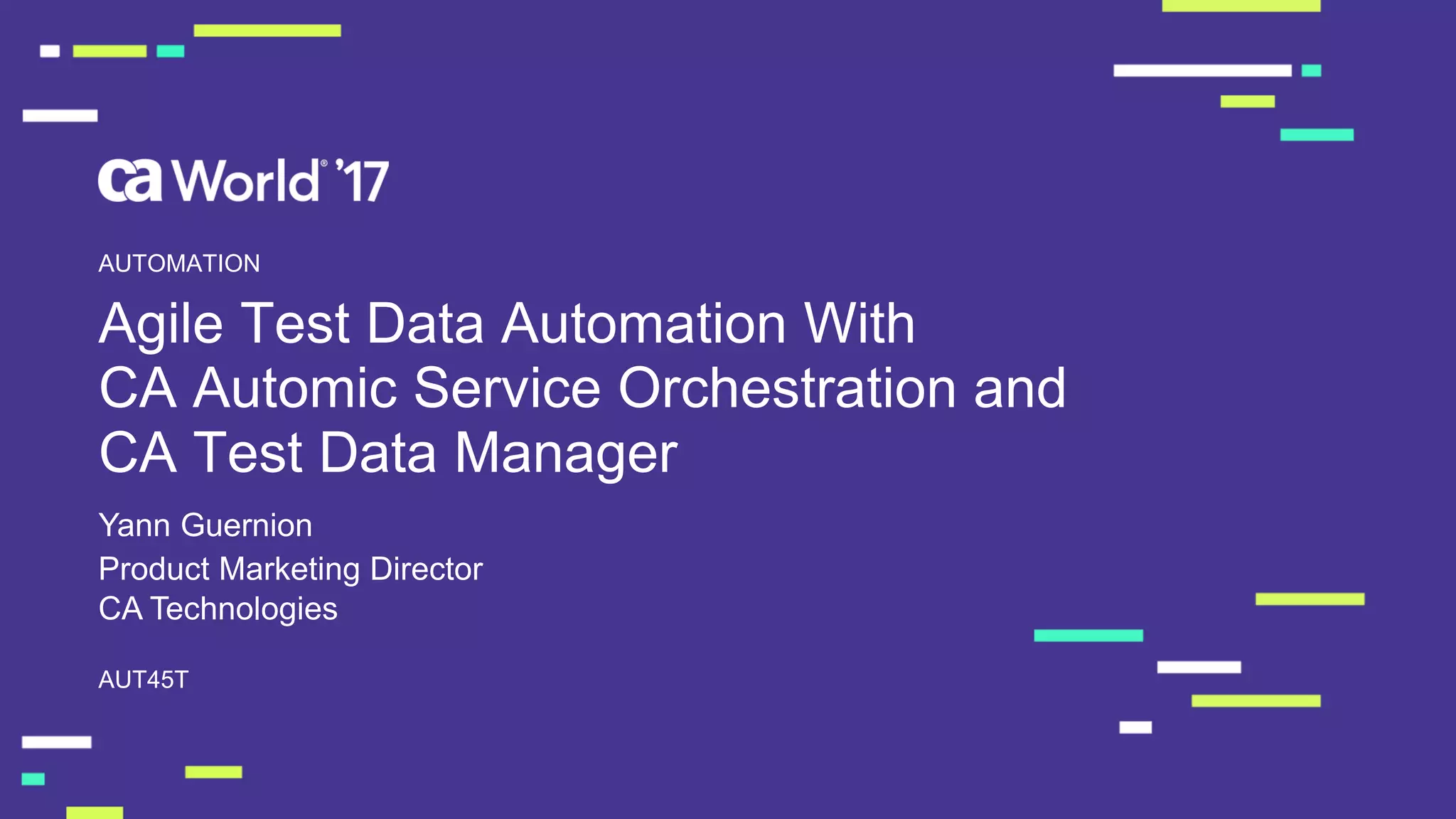 The document discusses the importance of automating test data management using CA's tools to improve efficiency, reduce costs, and enhance application performance in the context of the growing application economy. It highlights the shift from manual testing to automated solutions, emphasizing the capabilities necessary for agile development and rapid service delivery. Key benefits include significant reductions in time for data generation and increased IT productivity, ultimately leading to better quality and compliance in software development.