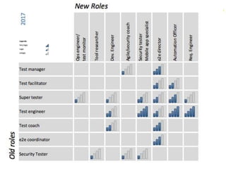 The document outlines trends and changes in the software testing profession as of 2017, emphasizing the importance of adaptability and new skill acquisition for testers due to the increasing influence of automation, DevOps, and agile methodologies. Key predictions include the integration of testing into the development process, shifts towards a more versatile testing approach, and the necessity for testers to embrace technical skills and value-driven decision-making. The document also highlights the evolving roles within testing teams and the importance of embracing emerging tools and practices to avoid continuous bugs and ensure high-quality releases.
