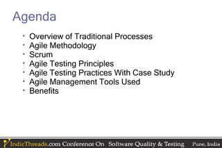 The document presents an overview of Agile testing principles and practices as contrasted with traditional testing processes, highlighting the benefits of Agile methodologies such as iterative development and team collaboration. It discusses the Scrum framework, the evolving role of Quality Assurance (QA), and various Agile testing practices supported by a case study. Key principles include continuous testing, shared responsibility for quality among team members, and early risk identification to enhance product quality and customer satisfaction.