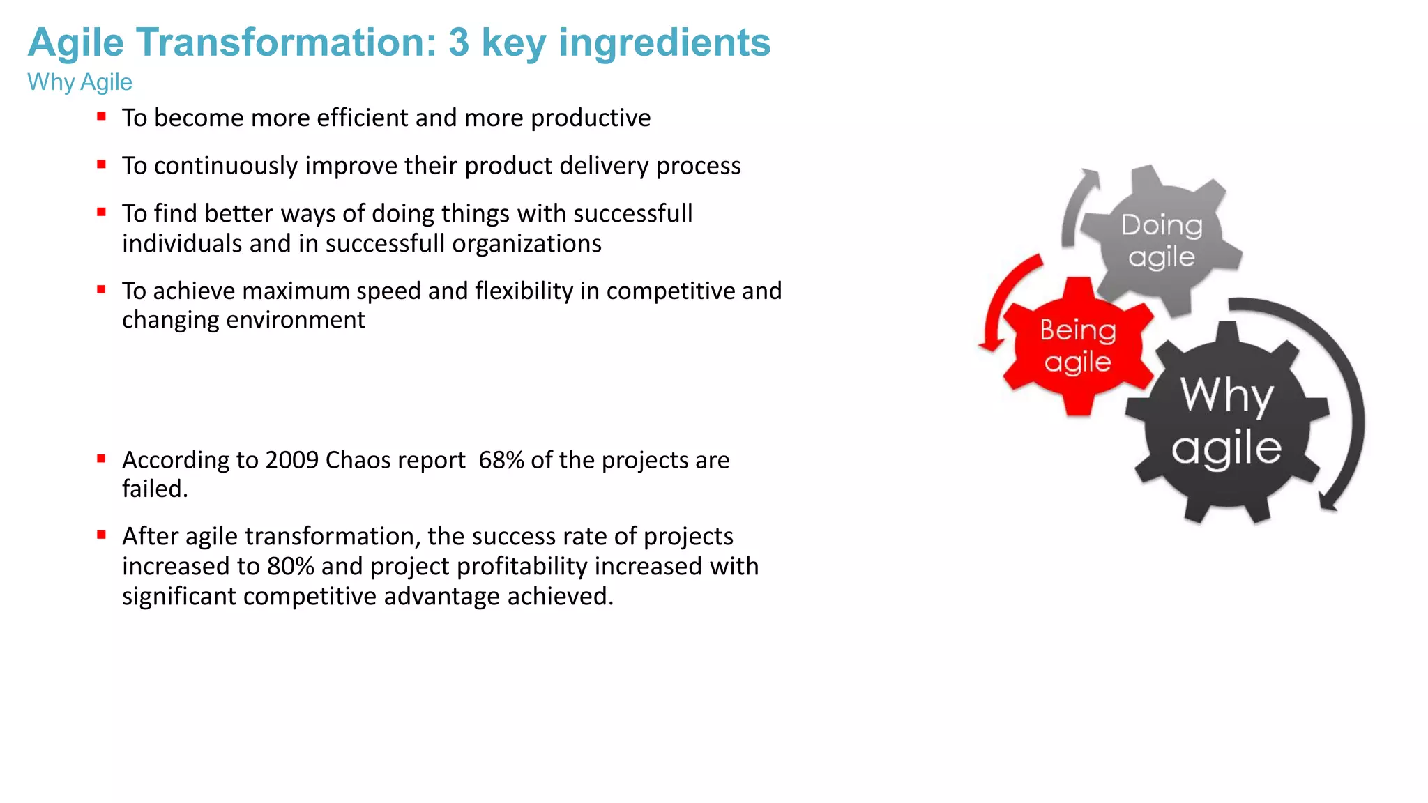 The document discusses an agile transformation process with three key ingredients: adopting practices and evolving them, building teams to model new behaviors, and finding tools to improve cooperation. It states that after agile transformations, project success rates increased to 80% and profitability increased. The transformation involves internalizing agile principles, building an open culture, and continuous improvement. Pilot projects are used to test changes through workshops, trainings and retrospectives. Barriers to enterprise-wide transformations include organizational behavior problems and a lack of transformational leadership. Benefits include increased agility, faster development cycles, higher customer satisfaction, and increased business value and employee happiness.