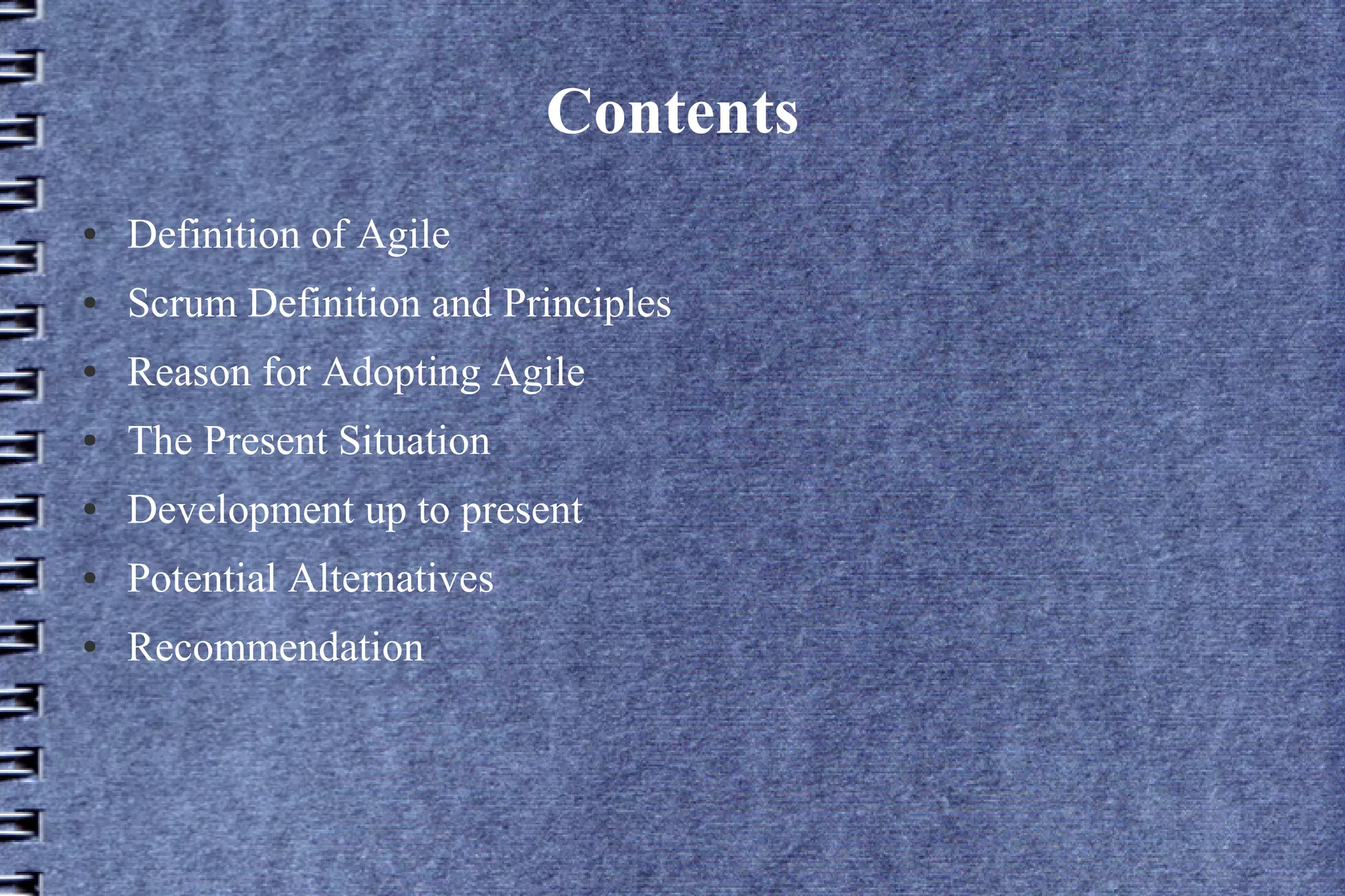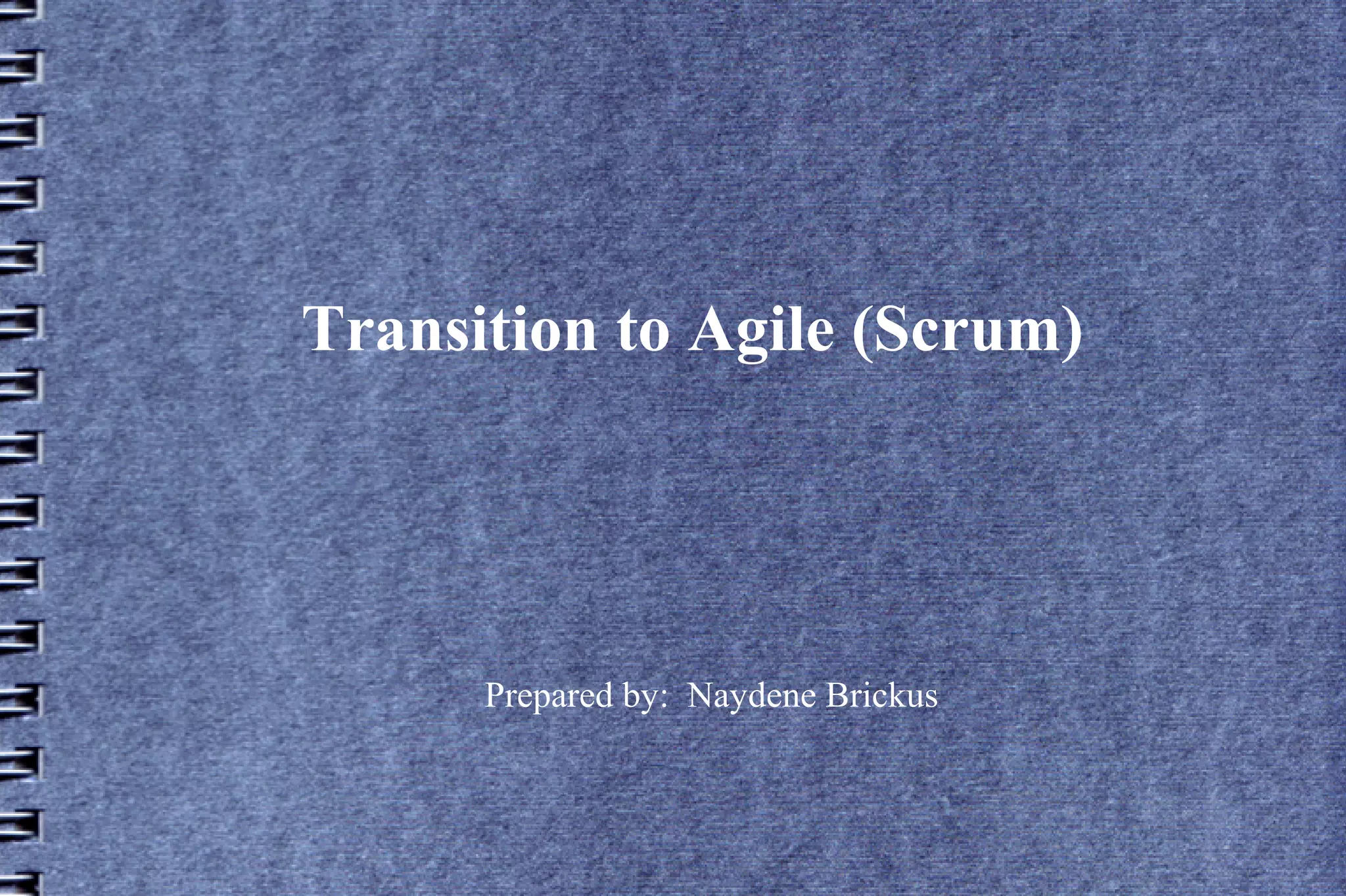 The document discusses transitioning to an Agile (Scrum) development process. It defines Agile and Scrum, and reasons for adopting them, such as increasing efficiency and responsiveness. It describes current problems like long, confusing requirements from a system perspective. It recommends implementing Scrum by phasing in participation, timeboxing features, demoing iterations, integrating QA, and defining roles.