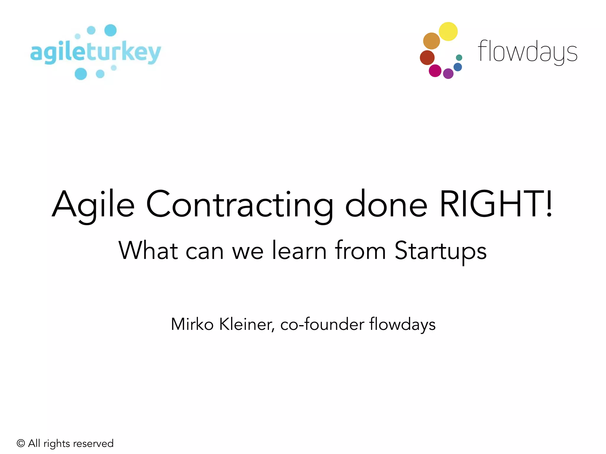 This document discusses applying agile principles to procurement and contracting processes. It provides an example case study of a company that used agile procurement to develop an offering with three suppliers over two days instead of the typical multi-month process. Key aspects of the agile procurement approach included empowering cross-functional teams, aligning around customer needs through workshops, and conducting public reviews of supplier solutions to provide rapid feedback and decision making. The case study demonstrated that this approach led to significantly faster timelines, lower effort, and more customer involvement compared to traditional request for proposal processes. Challenges and best practices of the agile procurement approach are also reviewed.