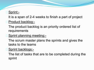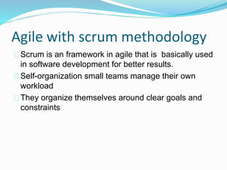 The document discusses various topics related to software development life cycles including waterfall, agile, scrum frameworks. It describes roles in scrum like product owner, scrum master, development team. It also covers 3-tier architecture, MVC pattern, coding best practices, testing strategies and source control.