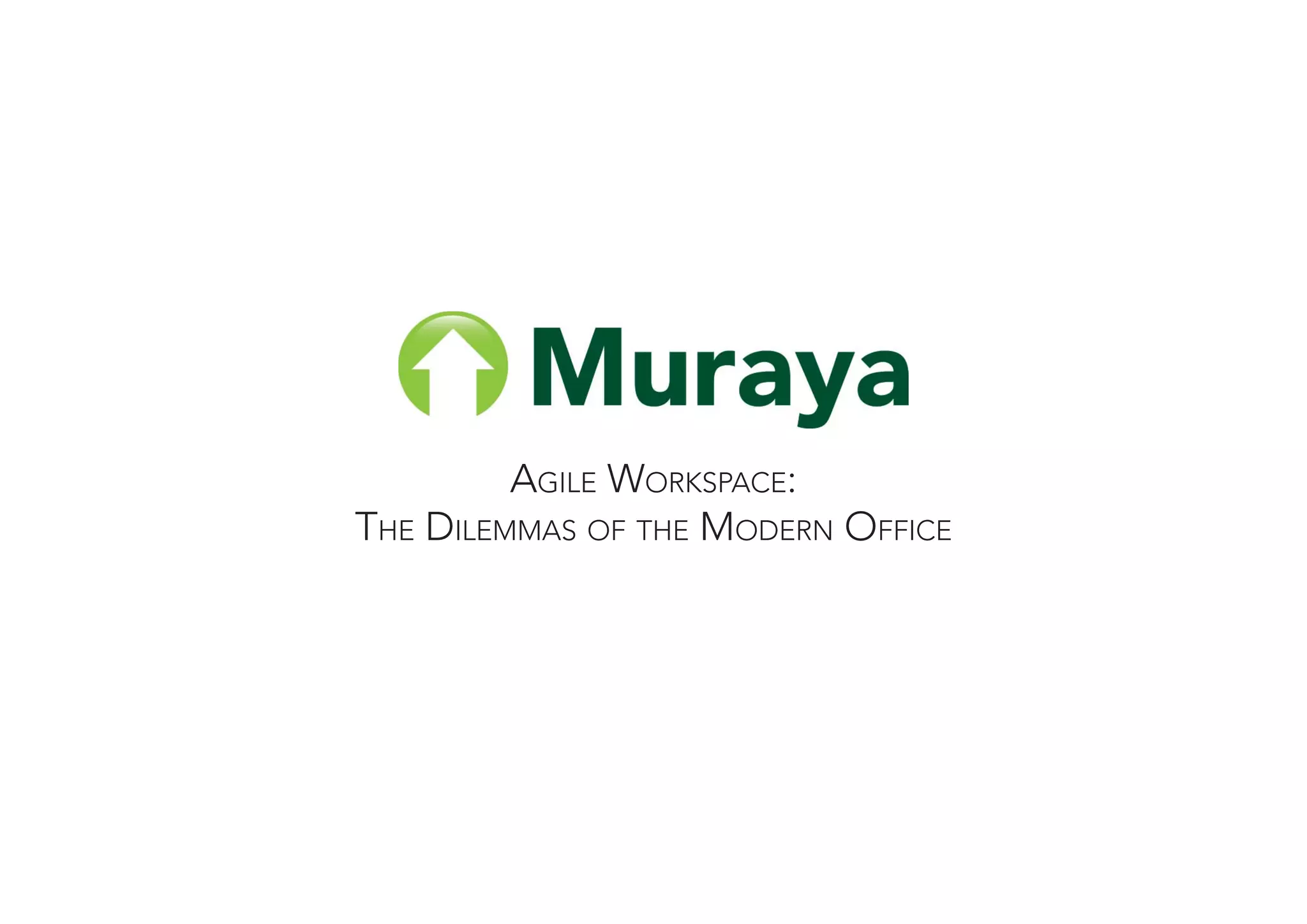 This document discusses trends in modern office design, including a shift towards more open floor plans, increased density, and more collaborative work styles. It notes generational changes that value things like personal growth, collaboration, and work-life balance over job security. Key questions are raised about whether these "agile" workspace changes positively or negatively impact productivity, efficiency, employee loyalty and satisfaction. Factors like individual control, feedback, cultural implications, and design solutions are discussed as important considerations for the changing workplace. Case studies of Muraya projects for clients like Boeing and Kimberly Clark are also mentioned.