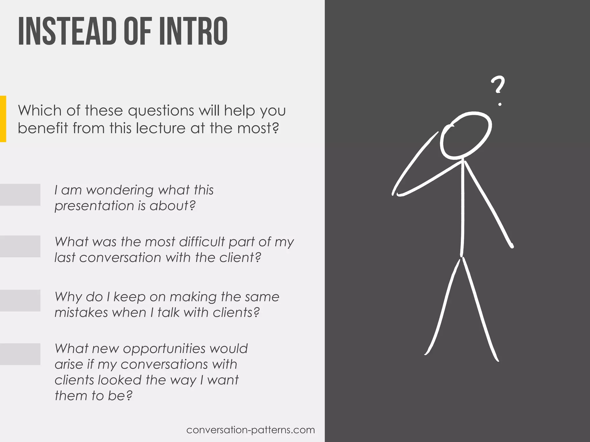 The document discusses the importance of effective communication with clients, particularly in understanding their needs and avoiding common conversational mistakes. It emphasizes the necessity of addressing specific business challenges and motivations in order to derive successful outcomes from client interactions. Additionally, it provides guidance on creating user stories and identifying needs through structured questions.