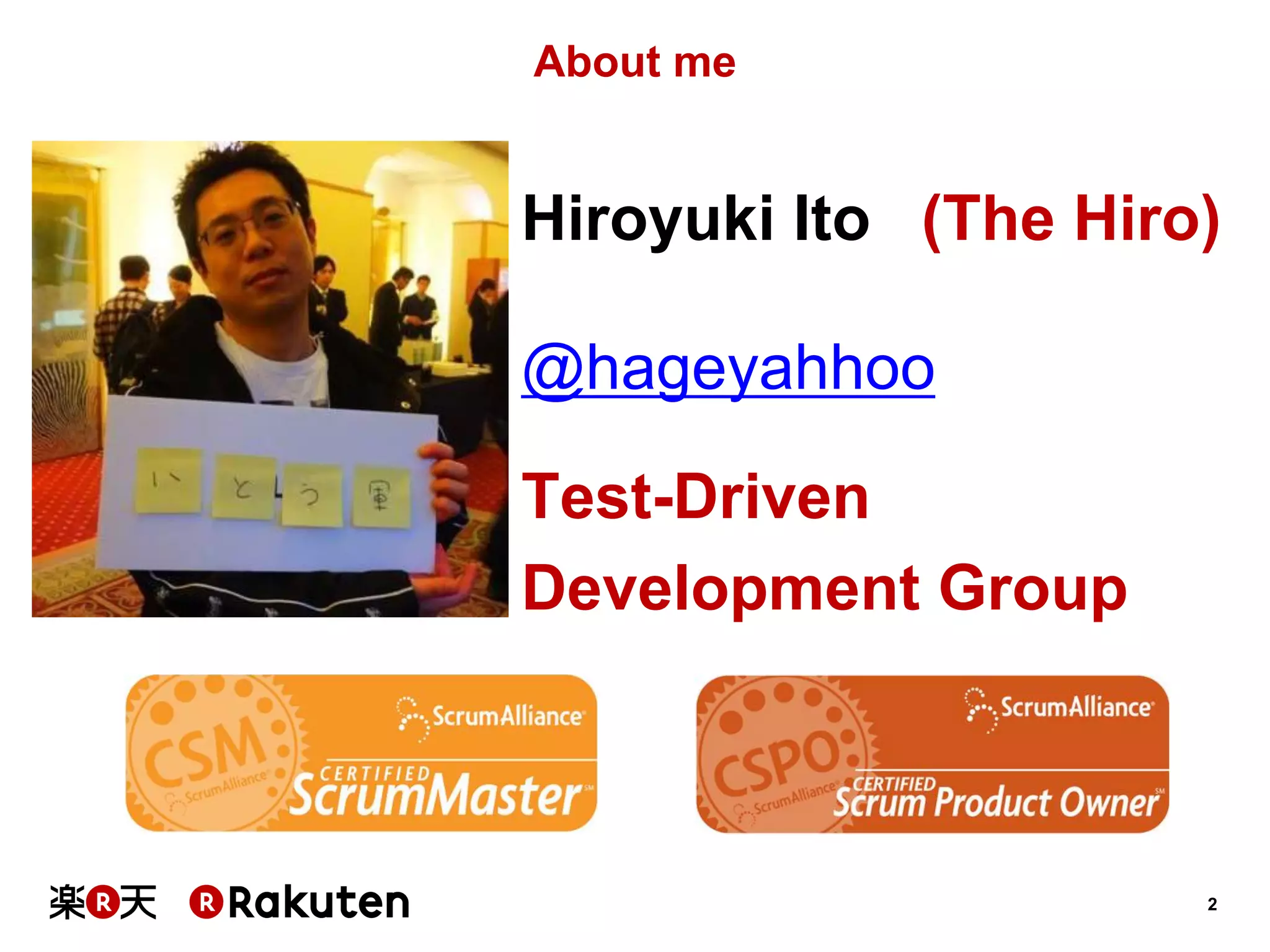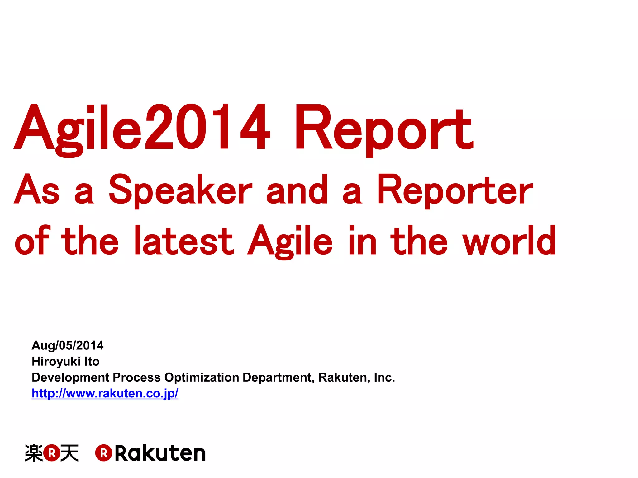 The Agile2014 conference, held in Orlando, Florida, featured approximately 2000 attendees and 272 sessions focused on the latest trends in agile methodologies. Key trends included the rise of enterprise agile practices, metrics utilization, and advancements in testing approaches such as TDD and BDD. The speaker, Hiroyuki Ito from Rakuten, shared insights on the importance of foundational technical approaches and the necessity for change in organizational mindset to foster agile adoption.