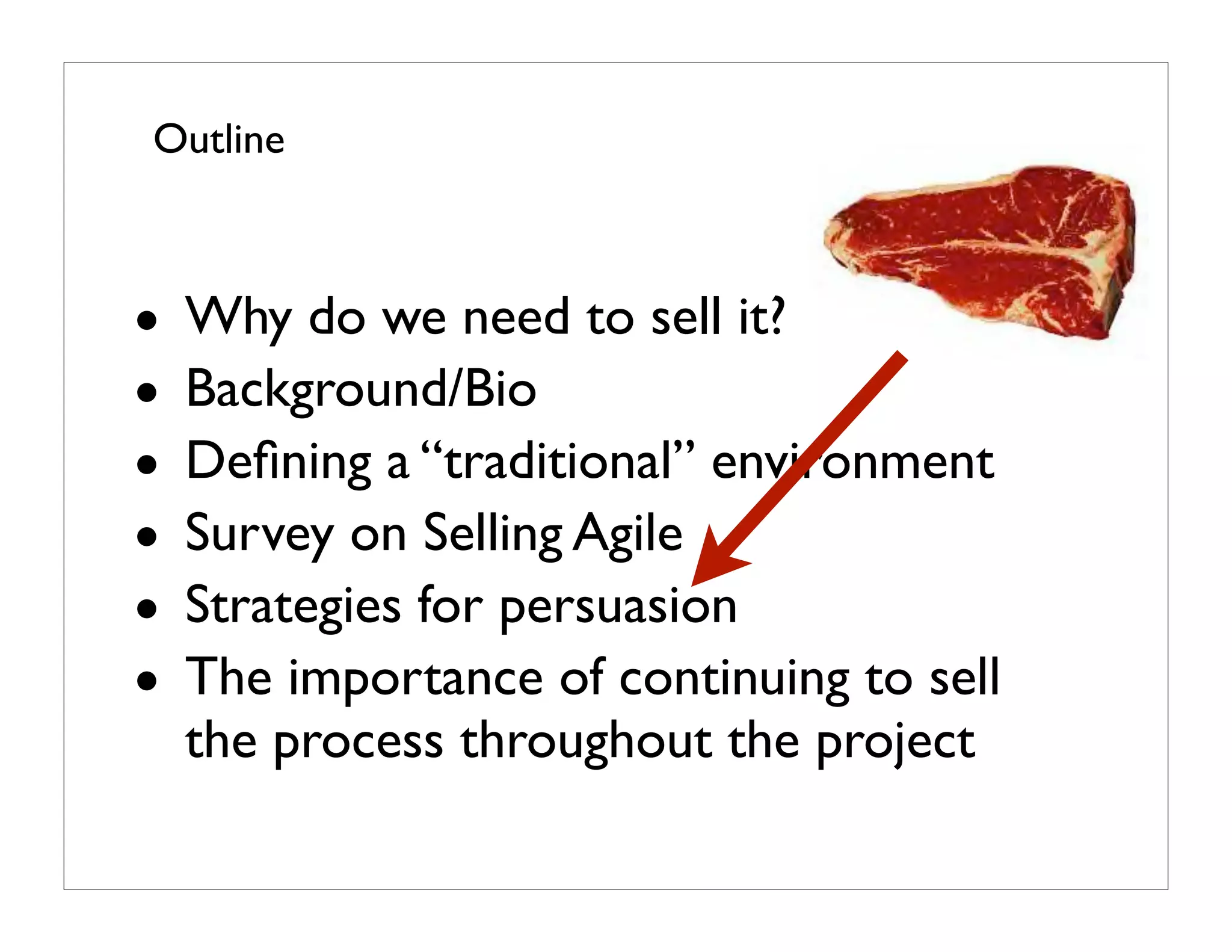 This document provides strategies for selling an Agile project plan to a traditional client. It begins with explaining why Agile needs to be sold and defines a traditional environment. It then discusses 11 strategies for persuading clients, including running a trial sprint, using case studies and metrics to show successes, finding a champion, and comparing Agile to other methodologies. It stresses the importance of continuing to promote Agile's benefits throughout the project. The document aims to help consultants overcome clients' fears of Agile and replace traditional upfront documentation with iterative development.