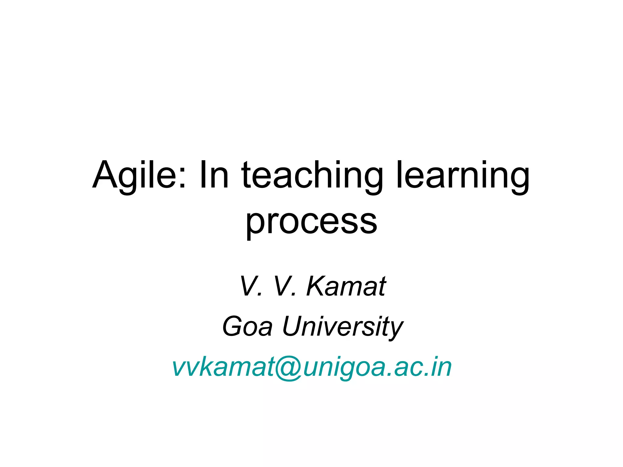 The document discusses applying agile principles to education. It outlines issues with the current education system such as a lack of collaboration between academia and industry, rigid curriculum, and outdated teaching practices. It then proposes adopting an agile framework in education to address these issues through practices like continuous feedback, collaborative project-based learning, and responsiveness to market needs over rigid syllabi and exams. An agile manifesto for education is presented focusing on competence, collaboration, employability and learning over compliance and formal degrees. Real-world examples from an MCA program show how agile principles have been successfully applied in evaluations and examinations.