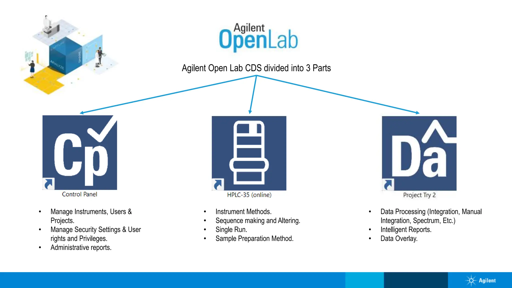 The document provides a comprehensive guide to using Agilent OpenLab CDS, detailing functionalities related to instrument management, project creation, and data processing. It covers processes such as logging in, instrument configuration, creating and launching projects, as well as performing data analysis and generating reports. Step-by-step instructions with clear options are provided for various tasks including method creation, sample analysis, and calibration curves.