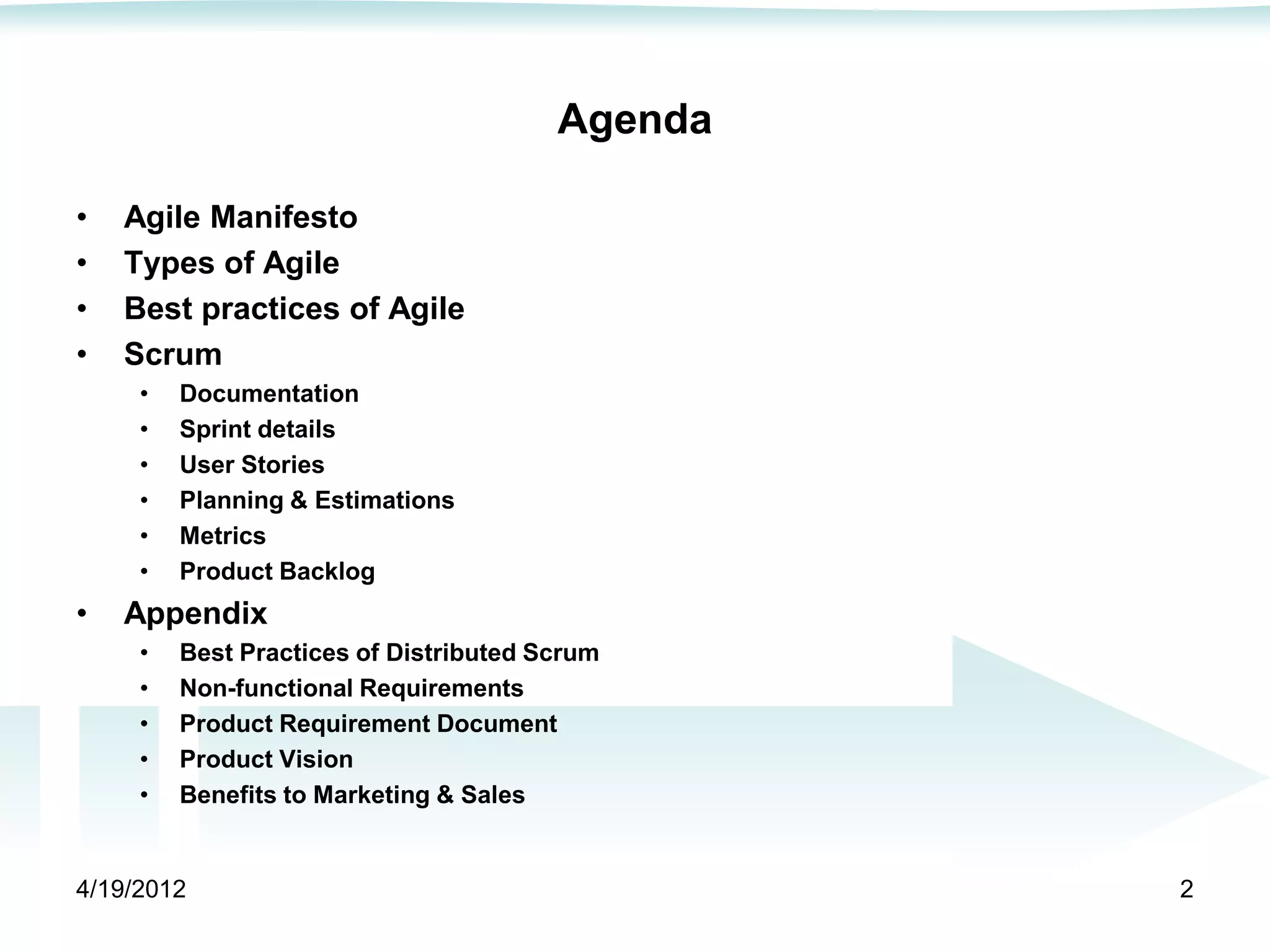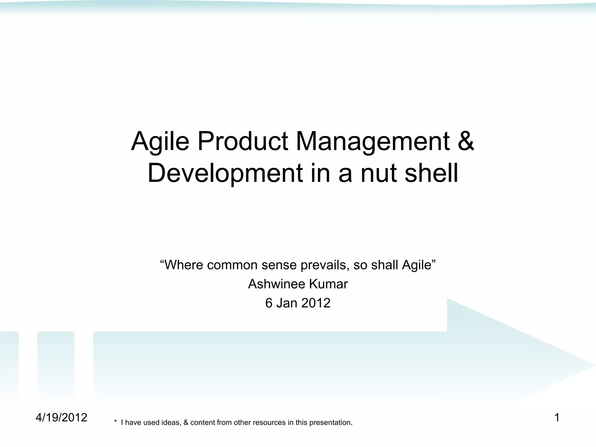 The document provides an overview of Agile product management and development practices. It discusses the Agile Manifesto and key Agile principles such as valuing individuals, collaboration, and responding to change. It also outlines various Agile methodologies like Scrum and best practices such as focusing on customer value and continuous improvement. The document dives deeper into Scrum practices for documentation, user stories, planning, metrics and more. It provides guidance on non-functional requirements and templates for documents like a product vision and requirements document.