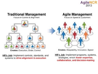 This document discusses how HR practices need to adapt to agile organizations. Some key points: