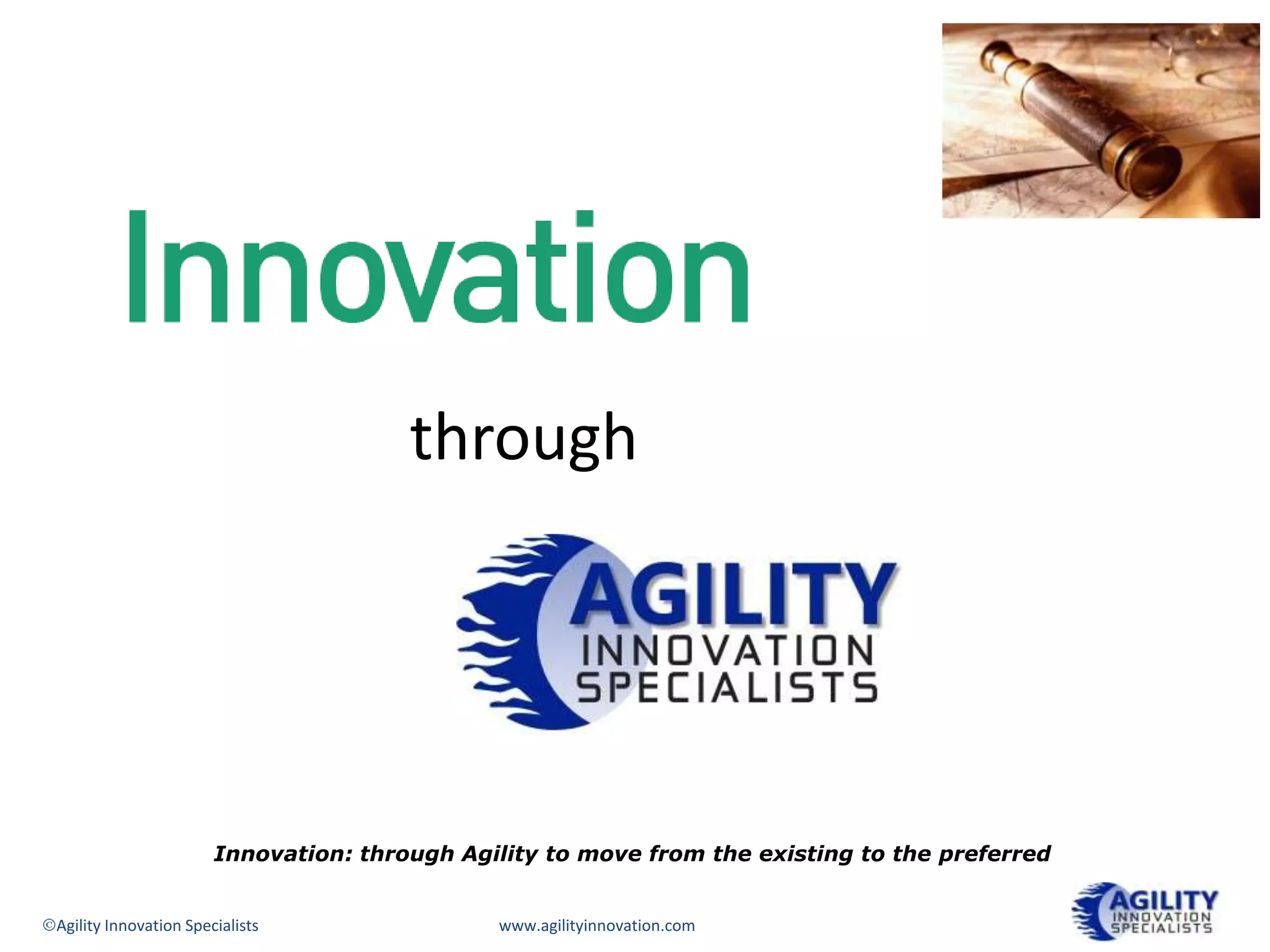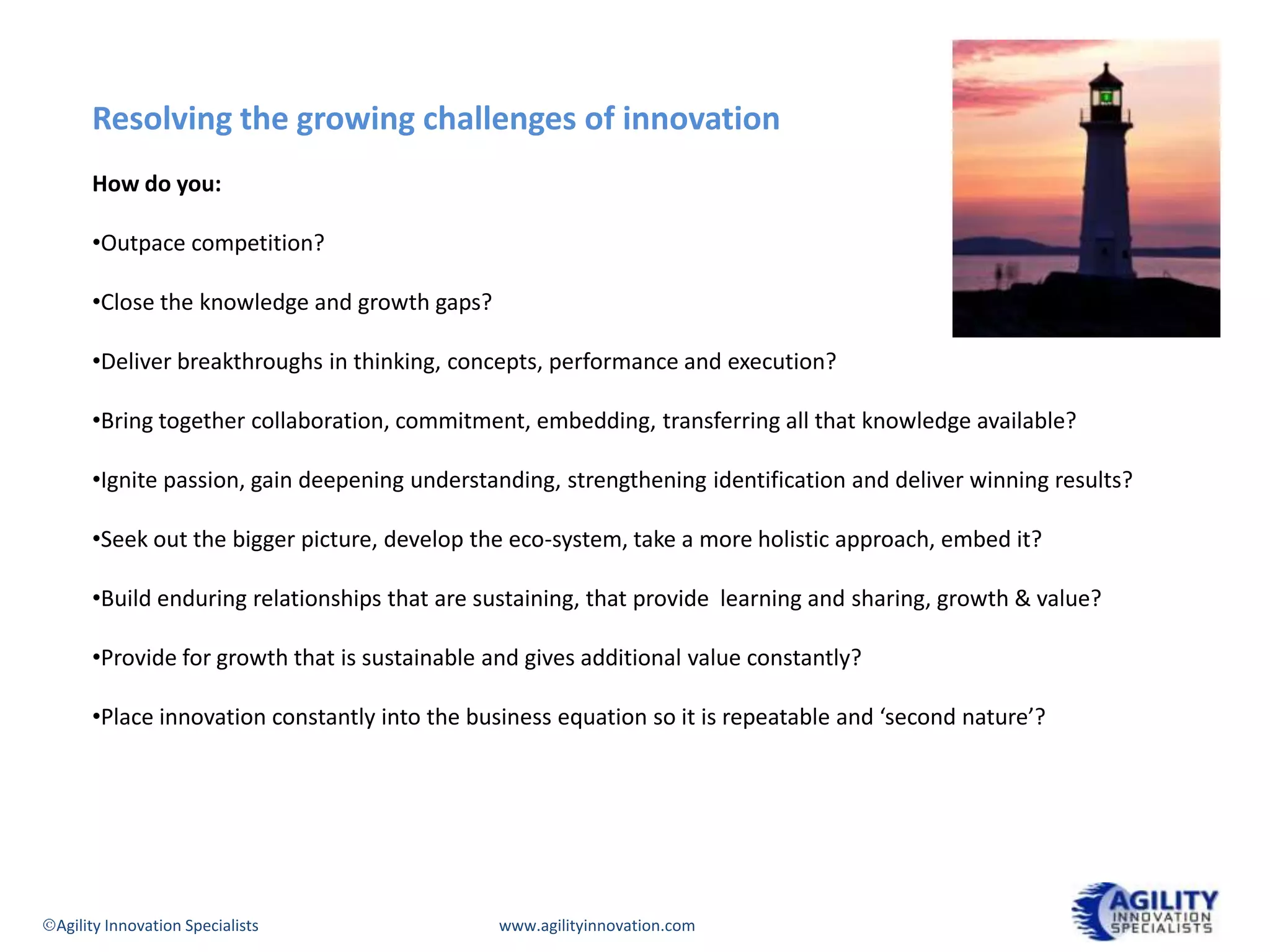 The document discusses resolving challenges of innovation through agility. It proposes that agility and collaboration can help organizations outpace competition, close knowledge gaps, deliver breakthroughs, and build enduring relationships that provide learning and growth. Agility Innovation Specialists claims to provide comprehensive innovation capabilities along the entire innovation value chain and help clients strengthen their strategic innovation vision, build capabilities, and accelerate innovative project solutions through new tools and techniques.