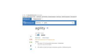 This document discusses the concept of agility. It defines agility as the flexibility and ability of an organization to rapidly adapt and change direction. Being agile is about consistently adapting to solve clients' needs through collaboration, speed, and stability. It emphasizes being practical over practices and focusing on outcomes rather than outputs. The document advocates for people-oriented agility through empowerment and increasing the meaning of work. It also discusses embracing mistakes as learning opportunities and having adaptive leadership to respond quickly to changes.