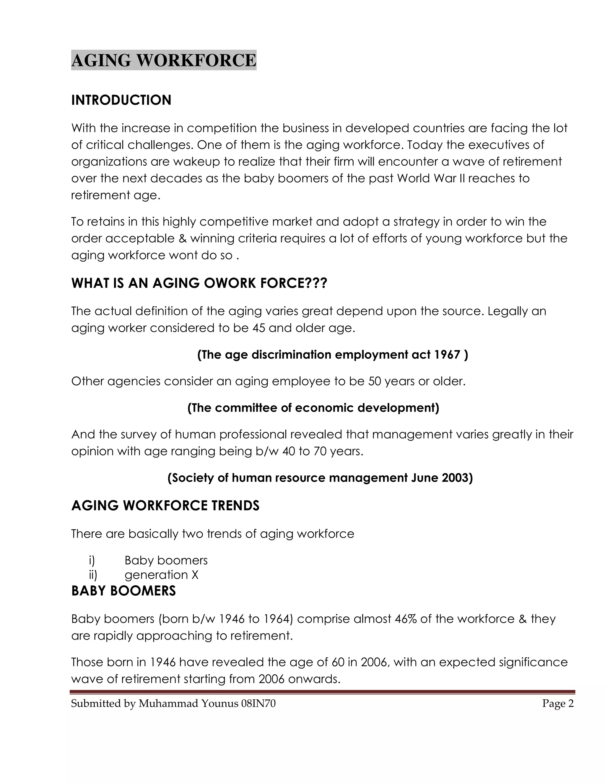 The document discusses the critical challenges faced by organizations due to the aging workforce, particularly the impact of the retiring baby boomer generation on labor supply and costs. It highlights trends indicating a shortage of younger workers and emphasizes the need for companies to adapt through strategic investments in health programs, training, and innovative management approaches. The text also introduces tools like the 5V-scorecard for measuring and managing workforce productivity and creativity in the context of an aging labor population.