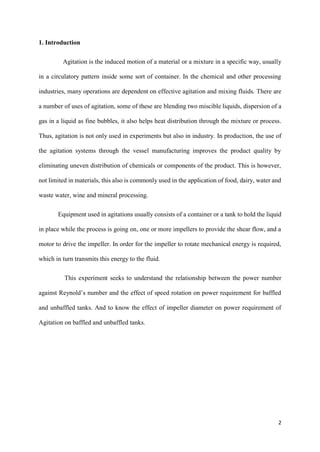 The document summarizes an experiment to determine the relationship between speed of rotation, diameter, and power requirement for baffled and unbaffled tanks. Data showed that power number decreases as Reynolds number increases, and is higher for baffled tanks than unbaffled tanks under turbulent conditions. The power requirement increases with impeller size but operating at very high speeds can lead to inefficiency through vortex formation.