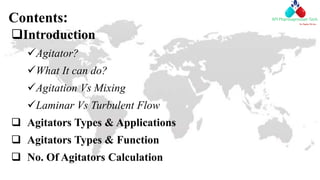 The document discusses various types of agitators used for mixing liquids in various applications, including their functions, advantages, and disadvantages. It contrasts agitation with mixing, explains the difference between laminar and turbulent flow, and outlines multiple specific types of agitators such as paddle, anchor, radial propeller, and helical agitators. Additionally, it covers the calculation for the number of agitators required in a system based on specific parameters.
